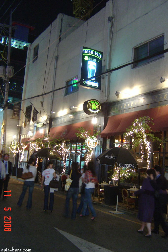 Large Irish style pub with dark wooden bar and interior-some small tables outside.