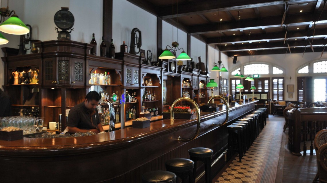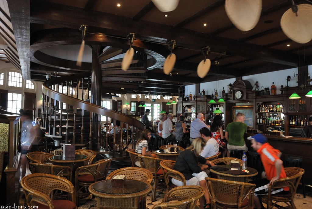 The Long Bar serves a full range of beers , cocktails, wines and non-alcoholic drinks. Pub food is available- either as full meals or just for snacks. And there are some tables outside on the wide balconies for al fresco dining. Also adjacent to the bar is the Long Bar Steakhouse – for more substantial grilled meals. A band plays contemporary music every evening on the upper level.