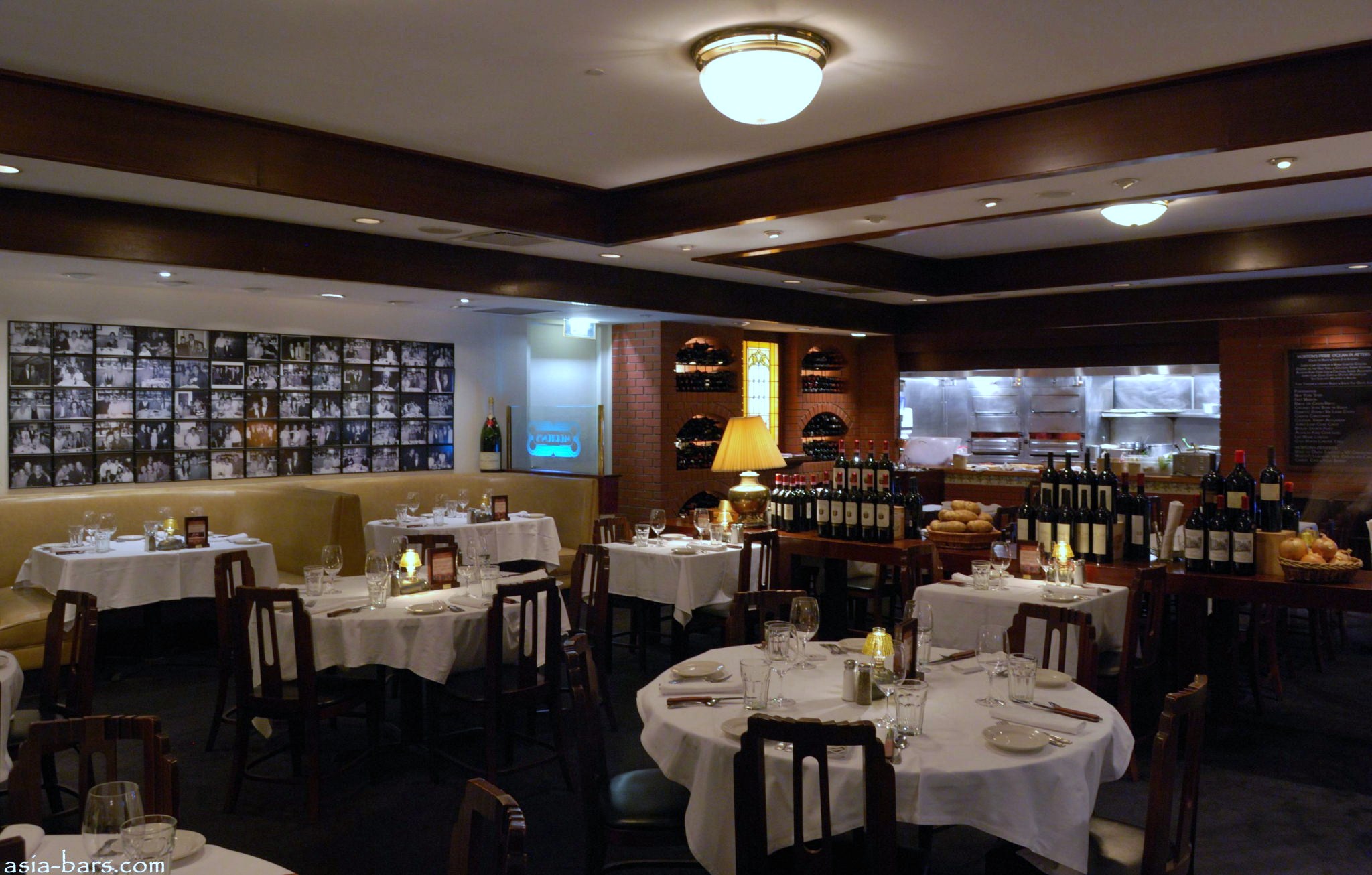 The Steakhouse main dining room has featured wine display tables and wall storage racks, an open “exhibition” kitchen, and both free-standing tables, and a number of leather upholstered dining booths along the walls.