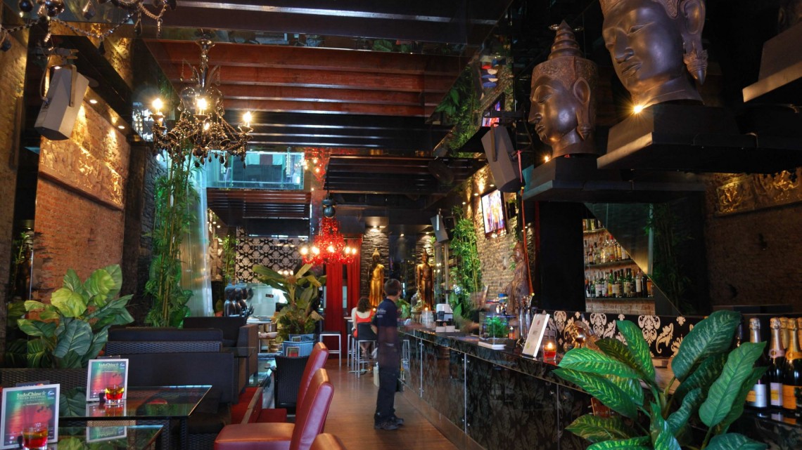 The interior of SaVanh Bistro + Lounge features raw exposed brickwork, with high mirrored ceilings and walls, and down one side of the interior- a large waterwall of black stones and bamboo and gently cascading water. The interior decor is highlighted by the signature chandelier lights and an eclectic assortment of Asian artifacts and sculptures set amongst comfortable lounge seating and low tables.