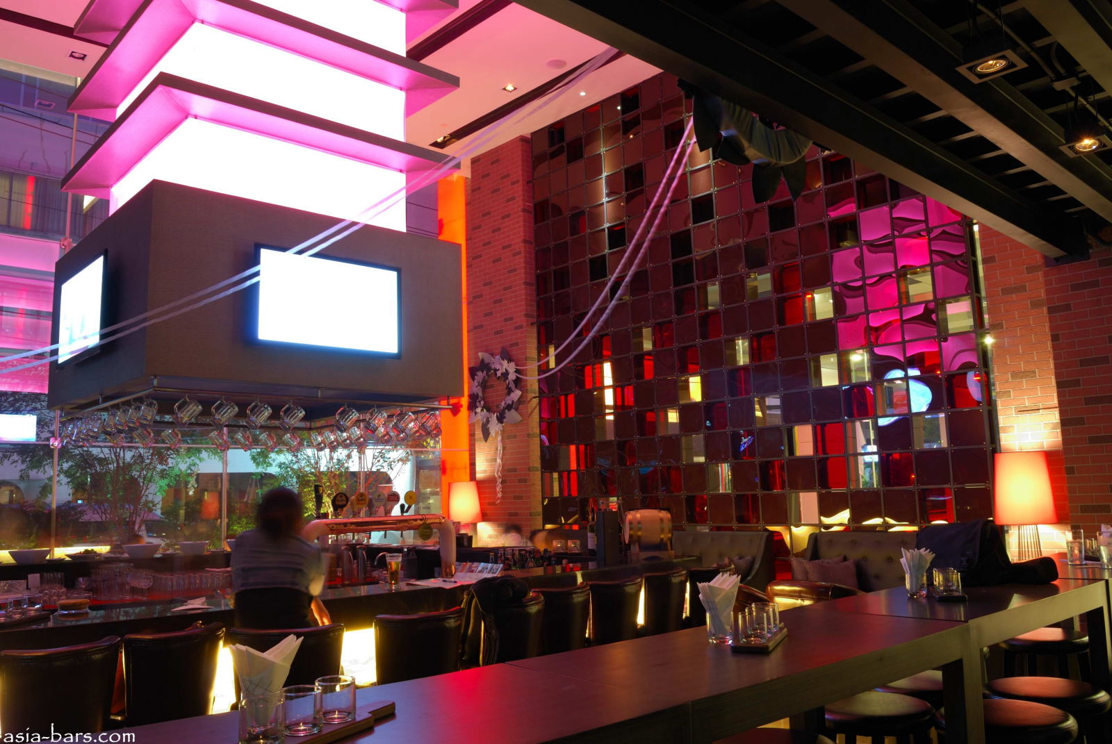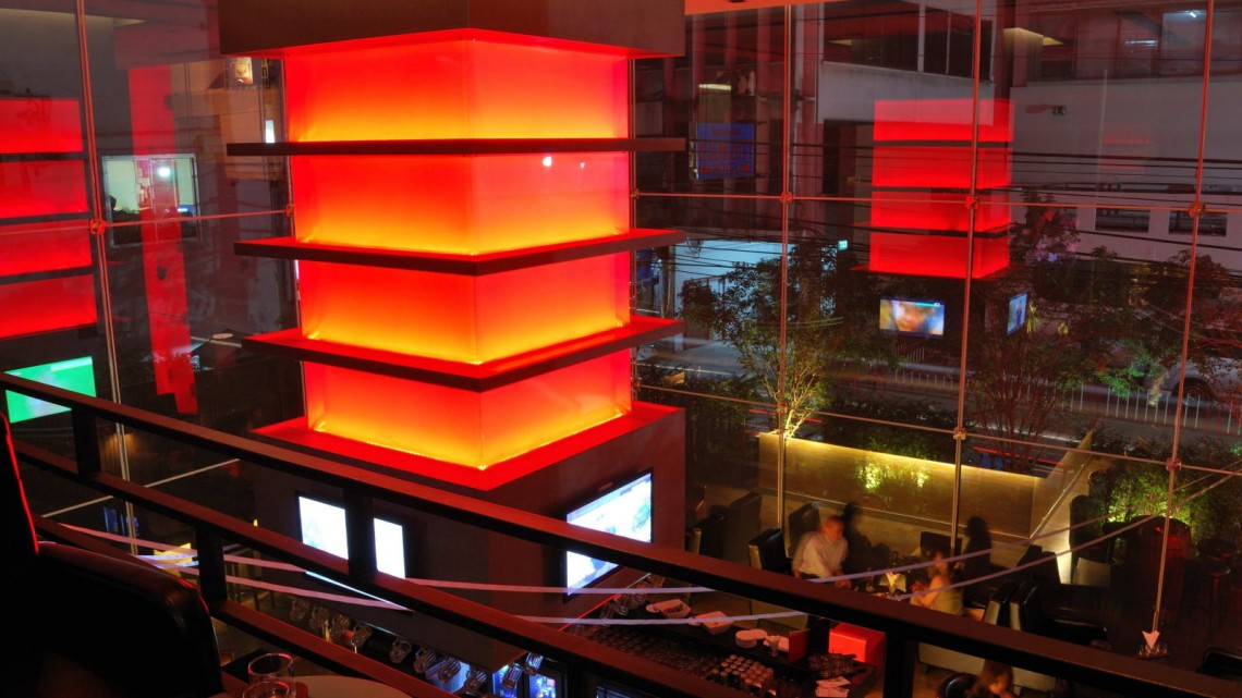The bar interior space is formulated around a square layout – with a large open central bar area, with seating at tables and around all four sides at the bar . The bar is dominated by a spectacular large overhead lighted structure mounted into the high ceiling and which has a “pagoda” style design- and is further highlighted by color changing LED lighting effects. The wall facing onto the hotel driveway is constructed from a colored mosaic of glass blocks that provides both a decorative feature and functional separation from the outside activity. The soaring double height ceiling and the glass wall street frontage creates a feeling of expansive space, yet the atmosphere around the bar is more of an intimate experience.