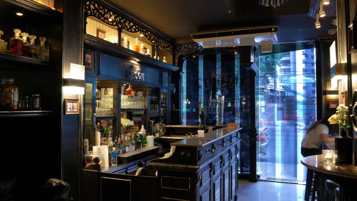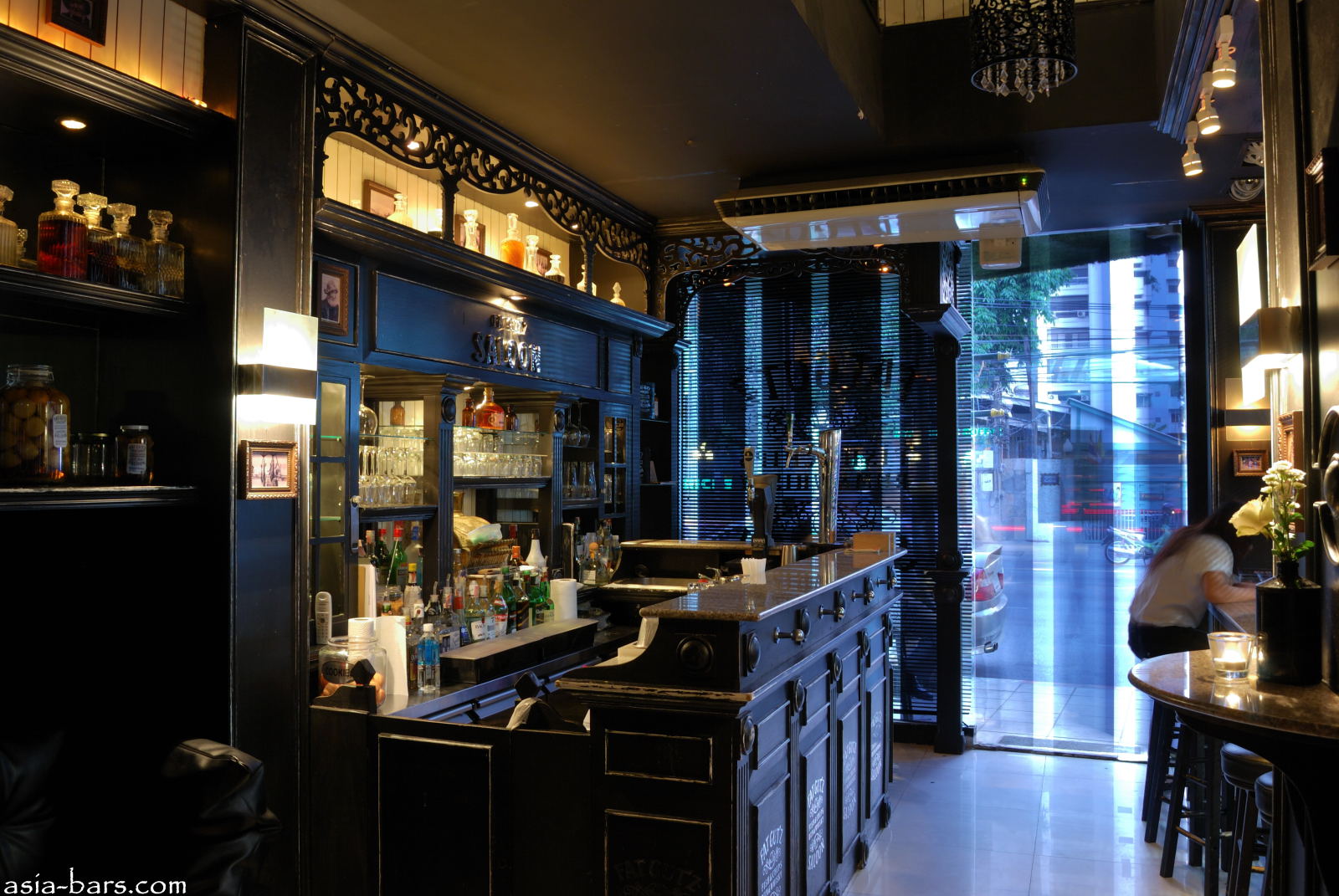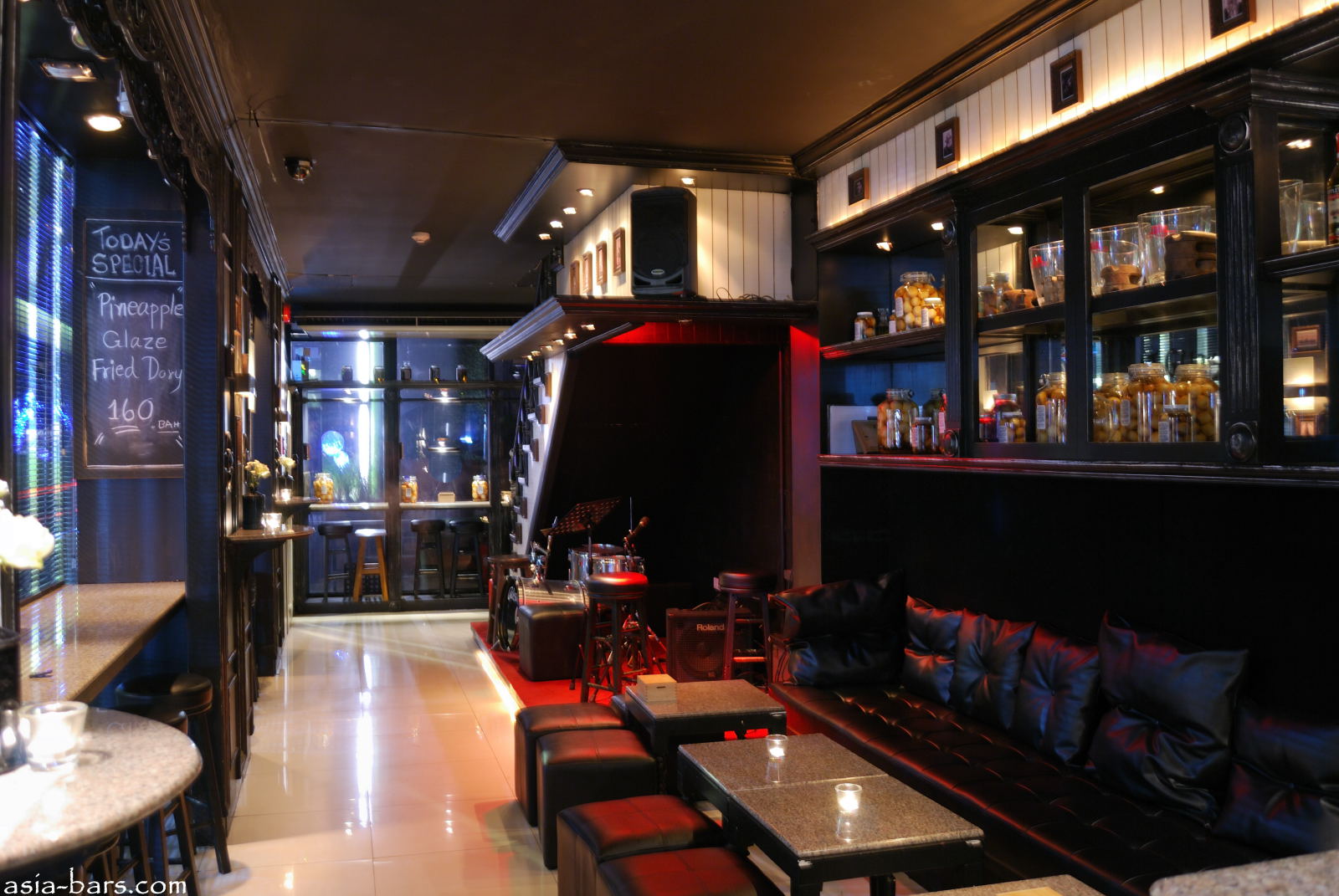 Approaching FAT GUTZ from the busy Thonglor main roadway, the dark sheet glass front and sides reflect back onto the outside street and add a sense of mystery as to what lies inside the entrance. The intial impression on entering does not disappoint- with a dark timber panelled interior and dimmed lighting providing a sense of warmth and comfort . The bar is placed prominently just inside the doorway- and then along the glass sided wall there are a series of grey granite topped counters and dark timber stools, and on the opposite side some leather upholstered seating and low tables. A small space under the stairs leading to the upper level is home to the house band, who play the “blues” nightly.