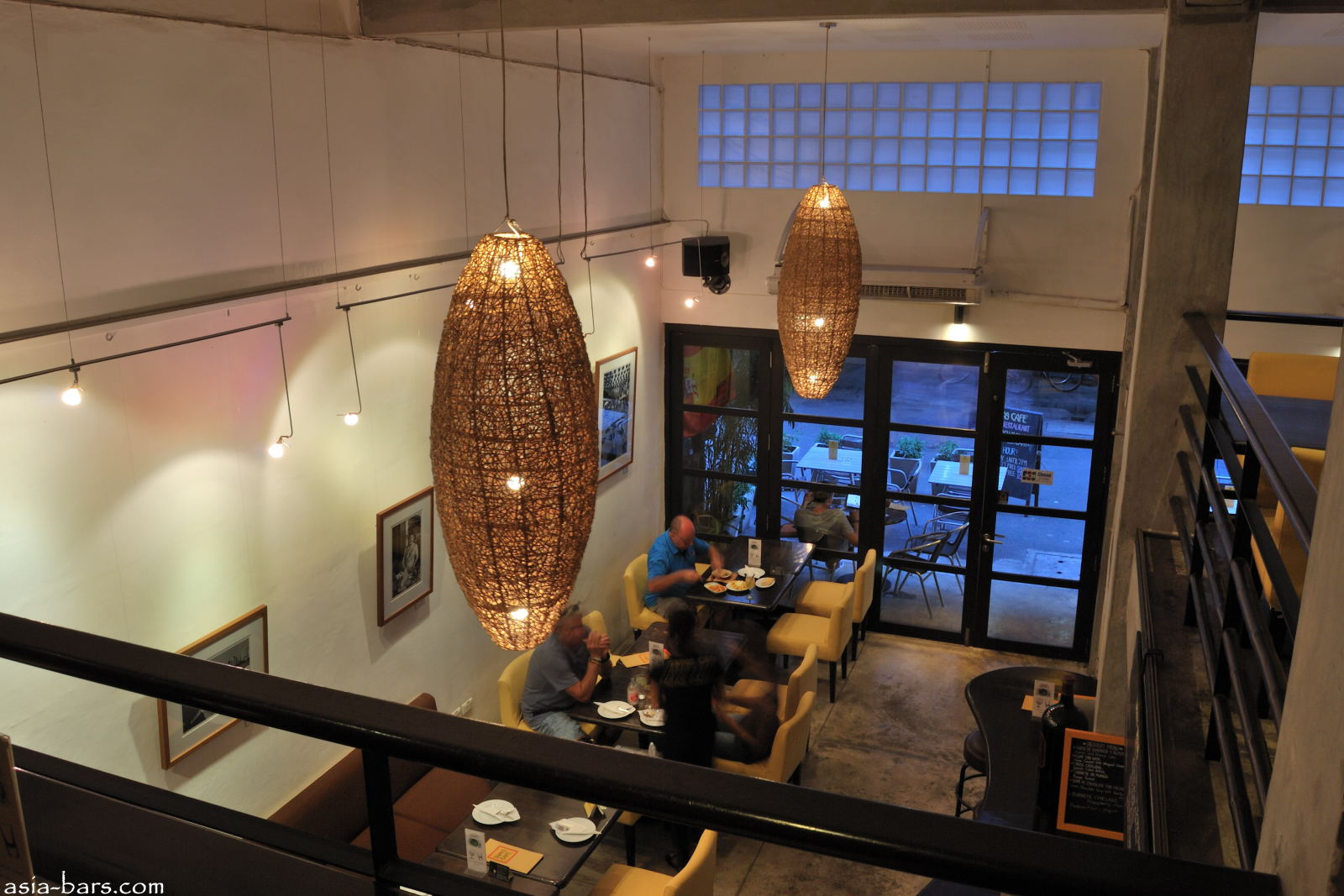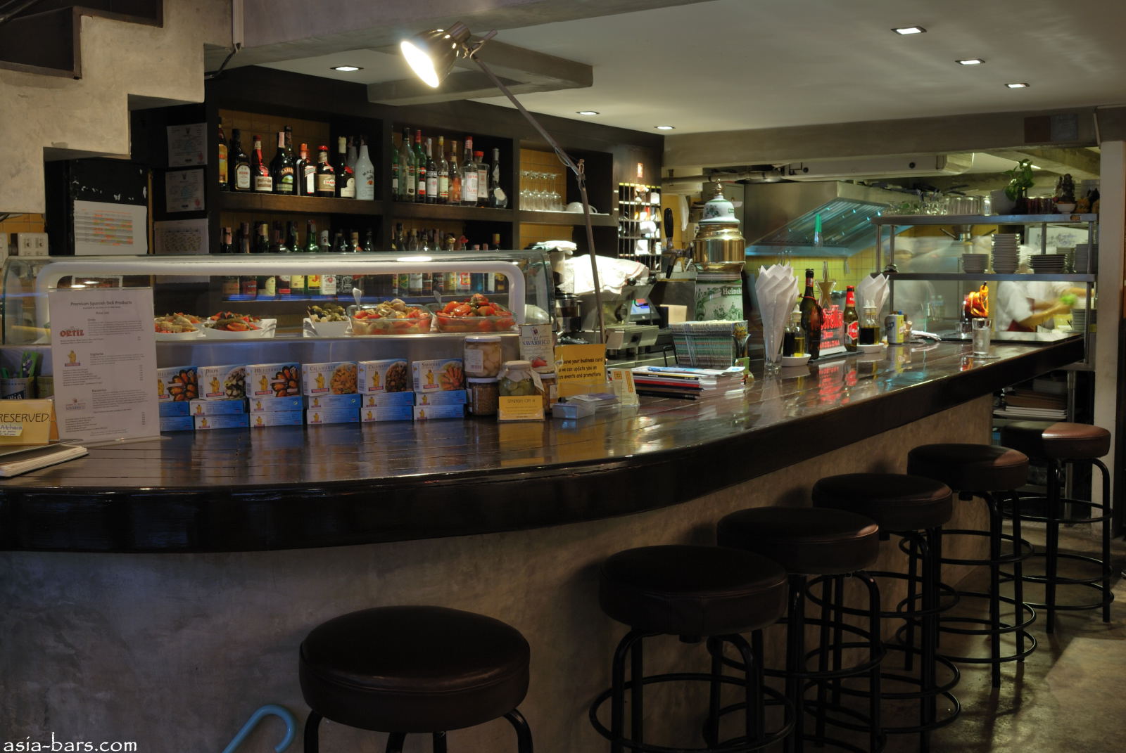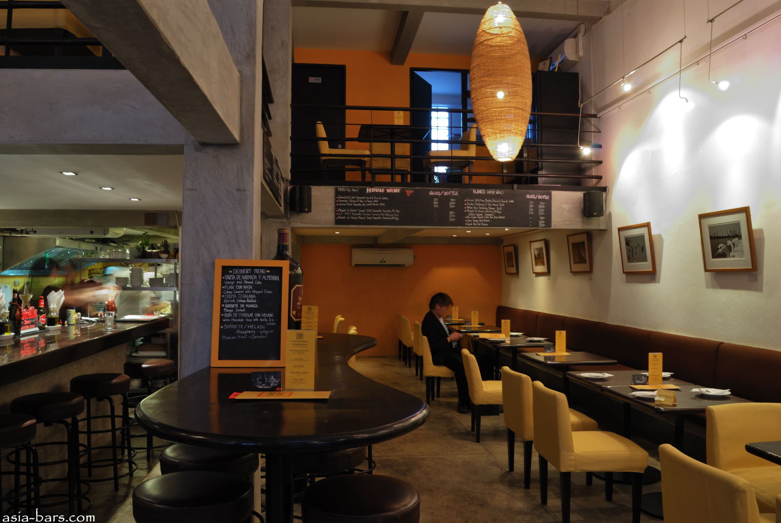 Tapas Cafe is housed in a renovated shophouse building over two levels, and with outdoor tables on the pavement of the pedestrian only sub-soi. The interiors have a clean, modernist style- with exposed concrete beams, large open spaces and with dining tables on both the main ground floor and on the smaller, more intimate mezzanine level ( which is a popular choice for small private parties). There is a dark timber bar adjacent to the kitchen with some bar seating, and also an “island” bar counter in the centre of the room.