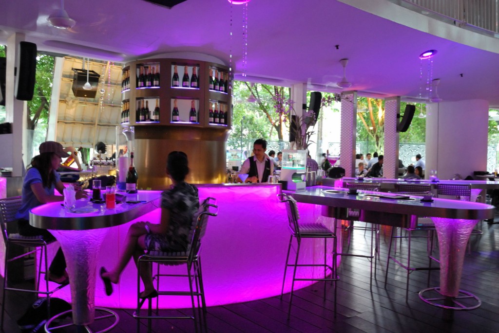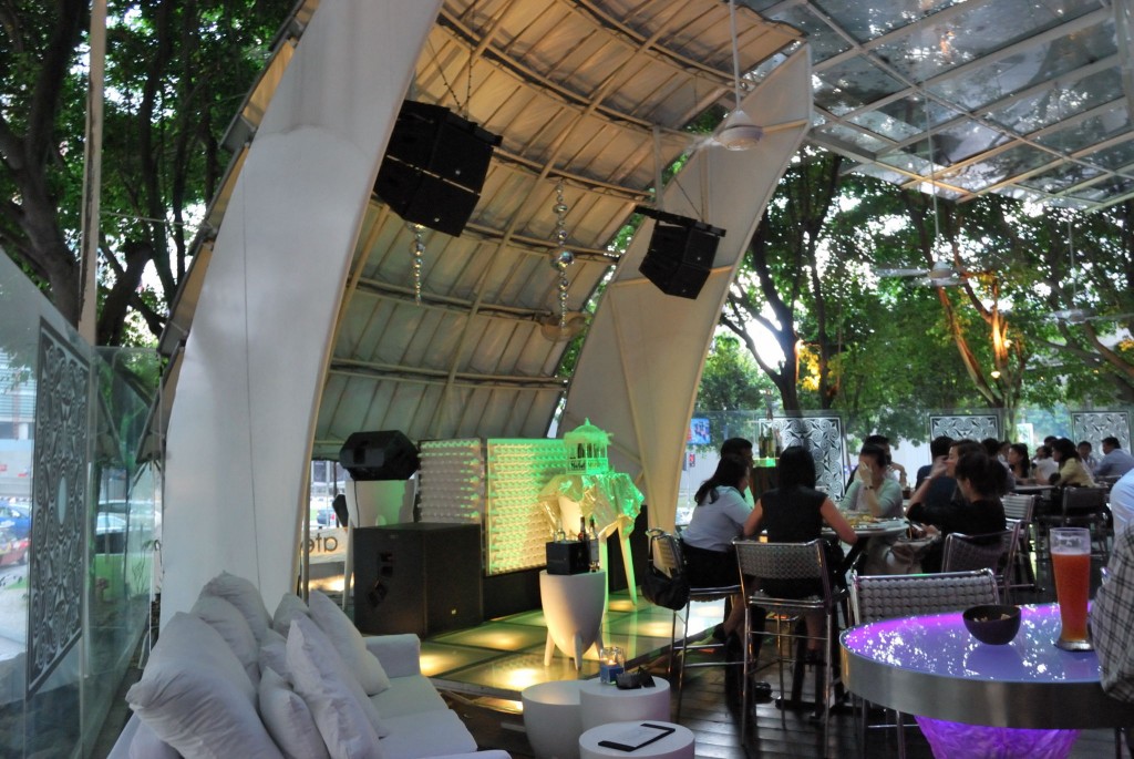The space itself is divided into two levels -with the main ground floor area consisting of a large central bar, lounge area and stage; and the mezzanine level also featuring dining tables around the curved floor, and a private room at one end. The entire space is fronted by full height glass and is partially open to the outside environment. Large transparent roofing panels extend out from above the mezzanine level accenting the “openness” of the space- and providing views across the road of the iconic KLCC “Twin Towers” . The design is sleek and modern- with mostly white furniture and finishes, contrasted with features such as old railway sleeper timber floors, a huge metal bladed overhead fan fitted to the mezzanine ceiling, and striking metallic gold “champagne” back-bar designs- the main bar on the ground floor is shaped to resemble a champagne cork, whilst the one on the mezzanine level is shaped like a champagne flute. Color changing LED lighting adjusts the mood during the course of the evening, and complimented by a robust sound system that transitions from an early evening chill ambiance to a more upbeat tempo later in the evenings.