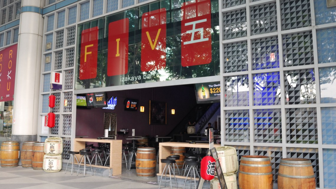 The Japanese Tachinomi Izakaya concept of “stand and drink” bars, where drinks and snacks are served cheaply and quickly, is very popular with the salarymen of Tokyo. The FIVE Bar is the first such bar to open in Singapore- conveniently located in the heart of the financial district of downtown Singapore- and directly opposite the waterfront of Clifford Pier and the Fullerton Bay Hotel. At FIVE Bar a wide range of drinks are on offer- all day- for SGD5.00 each– including Asahi draft beer, house wines and spirits, sake, shochu and choya.