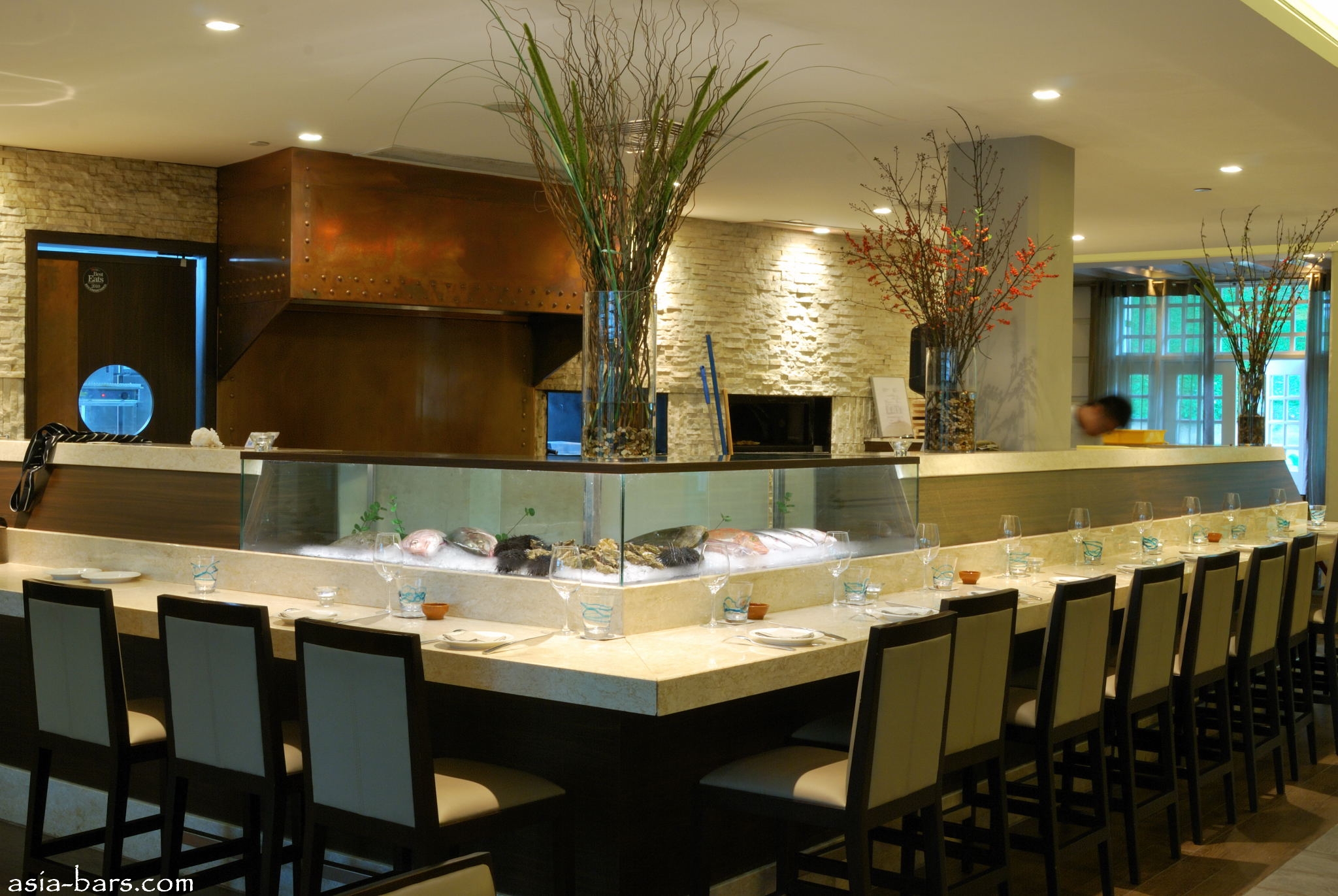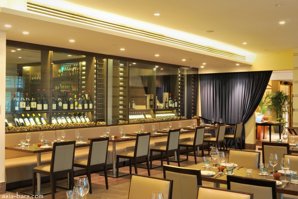 The restaurant occupies a bright open space off the main entrance lobby area of the hotel, and features white walls and ceilings, tiled flooring, with plenty of natural daylight from windows along both main walls during the day, and a subdued lighting effect in the evenings. Glass fronted wine cellars attractively highlight the extensive wine selections available. Seating at the prominent travertine pizza counter offers diners a close up view of the dramatic copper hooded charcoal grill and wood fired pizza oven. Fresh fish and shellfish lying in ice are displayed behind glass at the corner area of the counter. Contemporary Italian styled table furniture and chairs are set in a clean, uncluttered arrangement providing ample feelings of spaciousness in the main dining areas. A small private dining room is set into a space adjacent to the wine cellar with full height glass revealing selections of premium vintage Italian wines.
