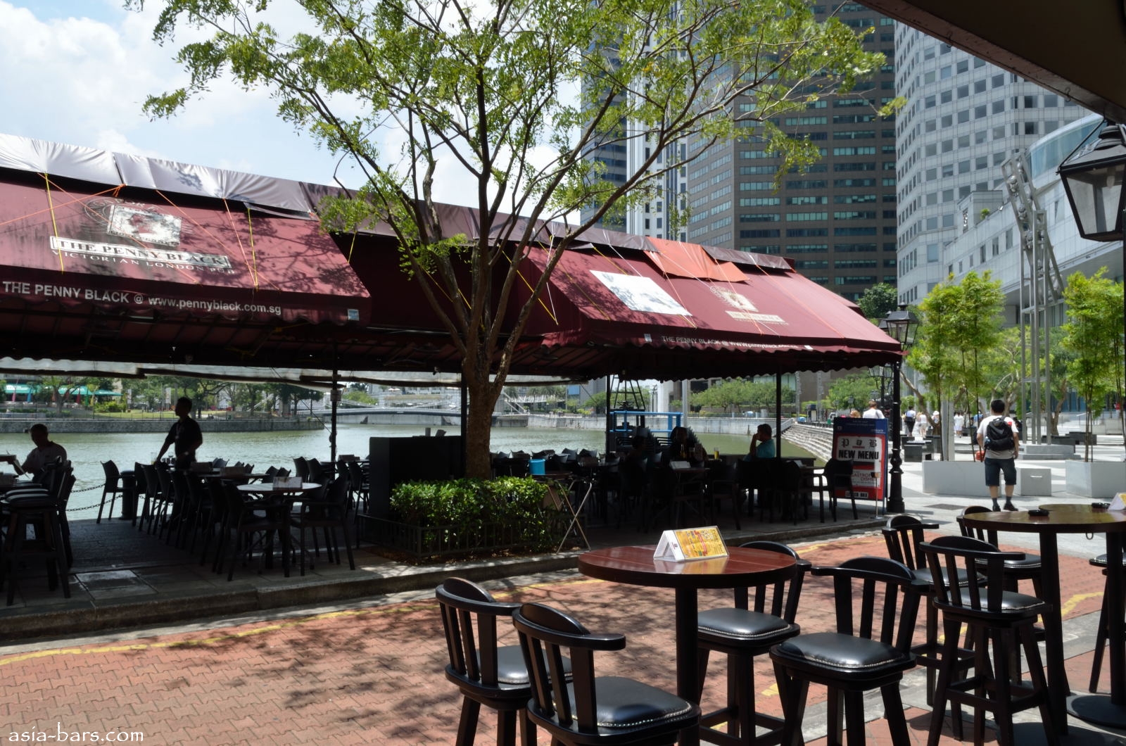 The Penny Black has bars and lounge areas over two levels inside the building, plus a large open-air terrace- sheltered under canvas awnings- right on the riverfront of the main Boat Quay promenade. The ground level features the long main bar, plus several discrete seating areas in the corners of the room, and a central bar area with high tables and stools. Numerous large flat panel screens carry all the major live sports events- and the pub is particularly busy on weekend nights of major sporting events such as English Premier League matches, rugby, F1 and cricket. The Snug bar up on the second level is a quieter area, with tables for dining, plus some comfortable sofas near the shuttered windows. This area is also popular for private functions, corporate events, etc.