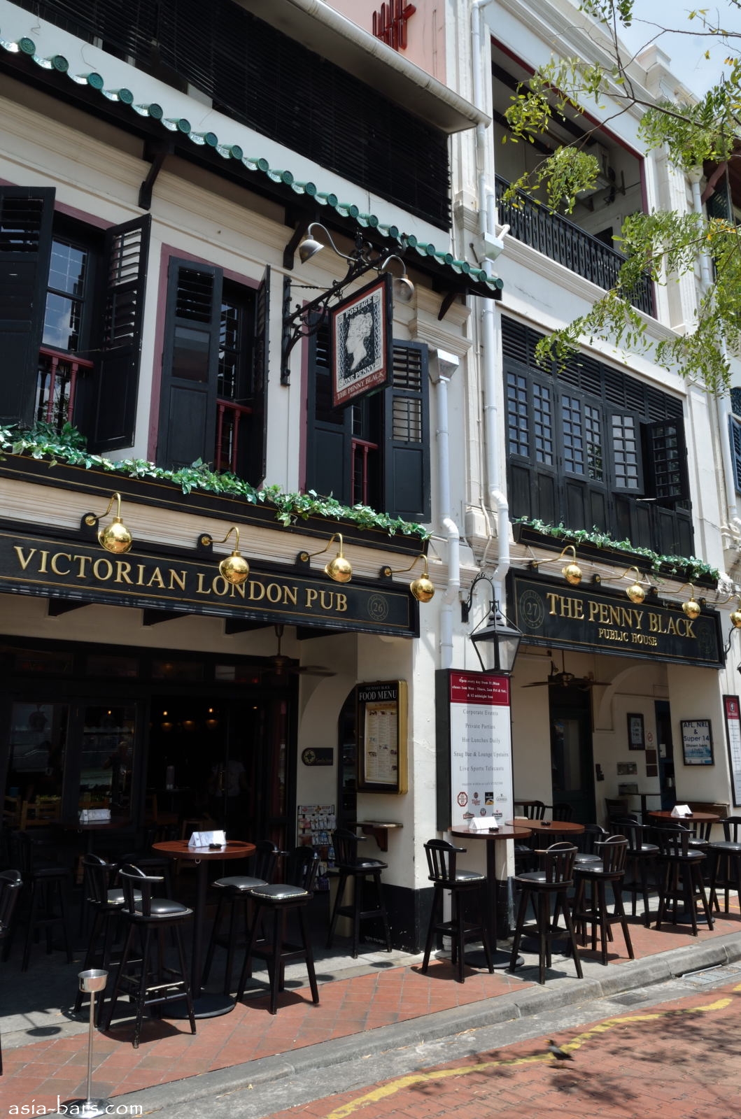 The prime position at the CBD end of the restored shophouses at Boat Quay gives The Penny Black a prominence to all visitors to the popular drinking and dining area. The result of an extensive makeover of two adjoined shophouses, The Penny Black is an accurate reproduction of the “classic” Victorian era London pub. In fact the entire interior fit-out was designed and fabricated in England, shipped out to Singapore, and then re-assembled on site by the same English craftsmen that built it in England. As expected, the interior features extensive use of dark timber for the furnishings, bar counters and flooring. Numerous examples of pub paraphernalia decorate the walls, and on the ground level bar area, an original red London postbox (the pub name derives from an English postage stamp) has pride of place in the centre of the room.