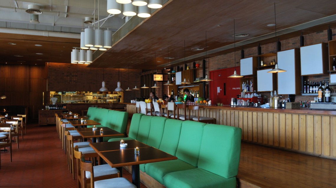 Canteen is furnished in a Scandinavian inspired style with extensive use of light colored timbers for both wall panelling, and much of the furniture. A long row of bright green upholstered bench seating delineates the main room from the slightly raised level of the cocktail bar, and provides a burst of color to the otherwise muted tones of the timbers and terracotta tiled flooring. An eclectic collection of vintage appliances from the 1950’s and 60’s- items such as a large salon hairdryer, manual cash register and mechanical weighing scales, are strategically placed around the room. In addition to the cafe tables, and small chairs along the bar, there are some plush sofas and armchairs in the window area for more relaxed moments with a coffee or drink.