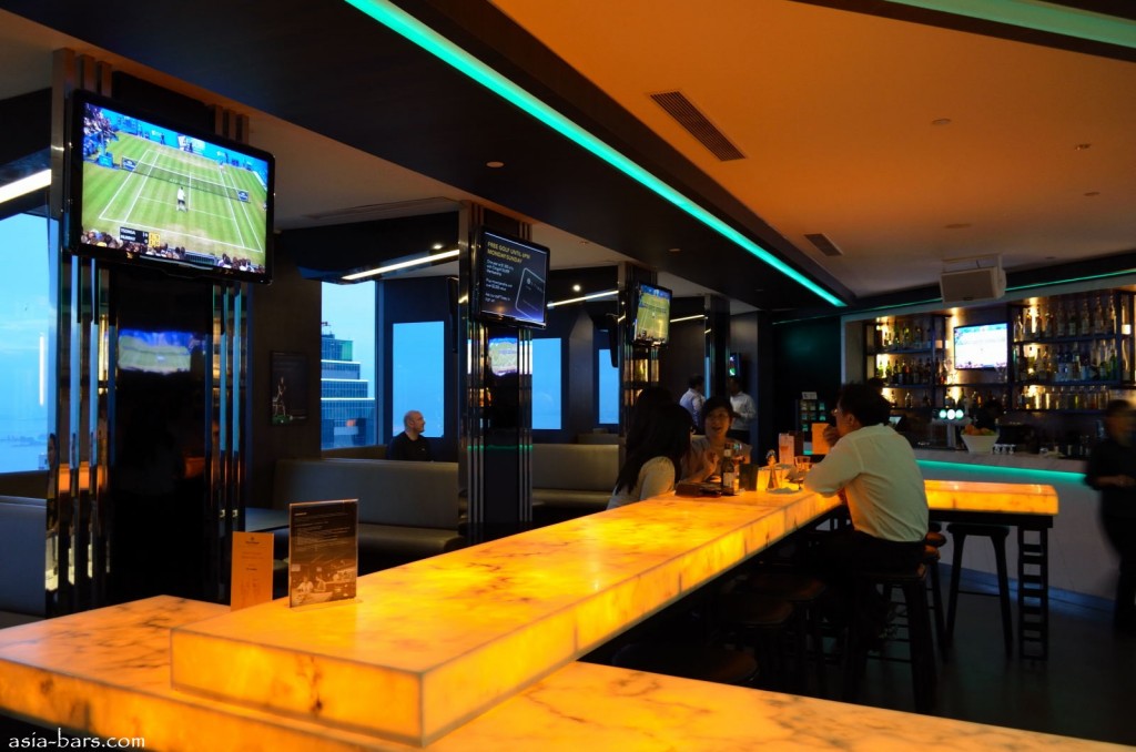 Located on Level 61, the 282 bar offers a venue for enjoying live sports telecasts presented on numerous large LCD screens positioned around the interior of the bar. A series of private booths line one of the walls- all with full height windows offering spectacular city views- each booth has its own overhead LCD screen for individualised channel selections. The contemporary design of the interiors include translucent benchtops lighted with LEDs providing a warm glow, and color changing LED lighting trims across the ceilings and under the white marble bartop.