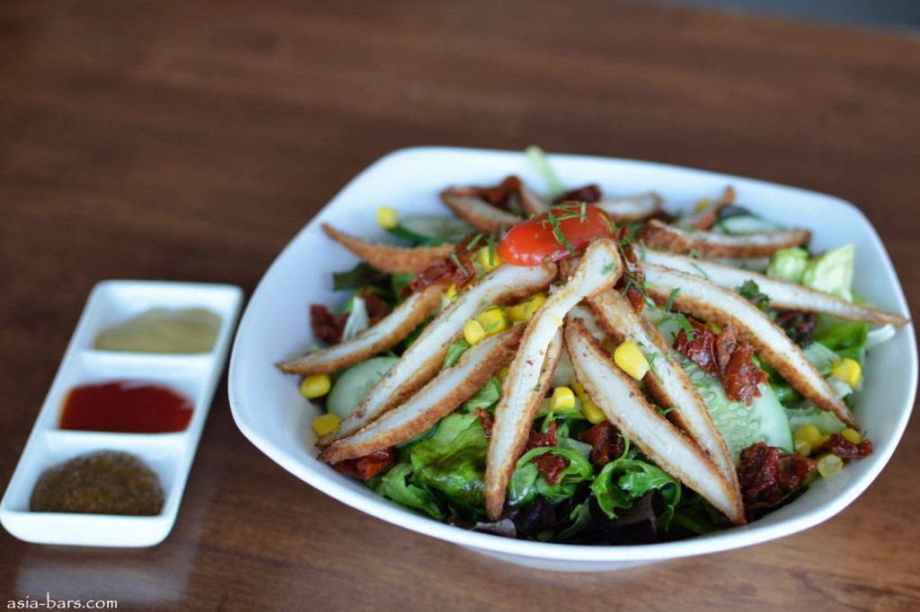 Backhendlsalat: A fresh salad with crispy chicken fillet, potato salad, semi-dried tomatoes, sweet corn, cucumbers and pumpkin seed oil tossed with housed dressing.