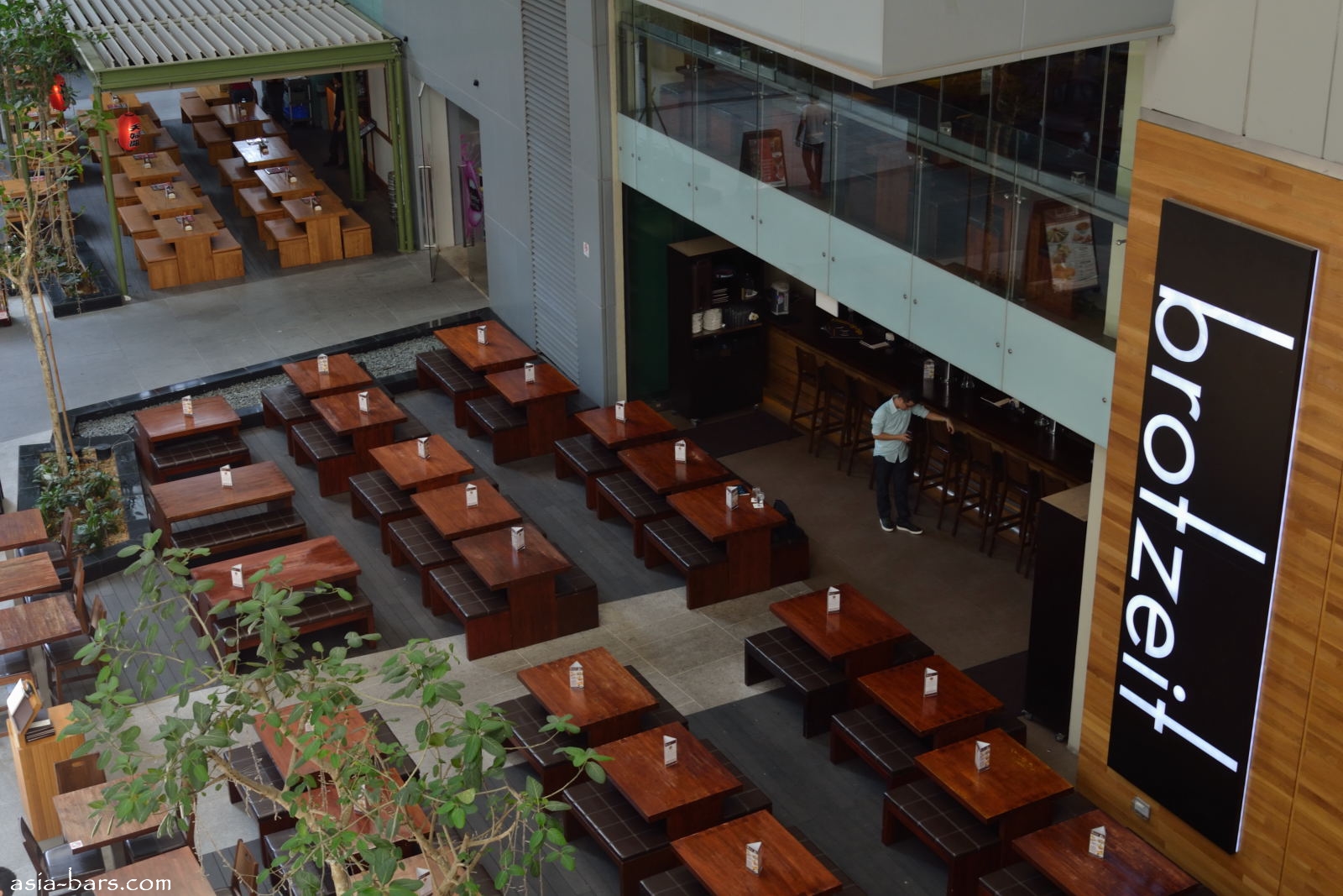 The Brotzeit restaurant at 313@ Somerset is located on the ground floor at Discovery Walk- right in the centre of the busy Orchard Road shopping district. The restaurant layout features a large open biegarten area at the front, with the main bar along the back wall. A second level upstairs holds more dining tables in an indoor air conditioned environment. Seating is at the characteristic timber bench tables of BROTZEIT restaurants.