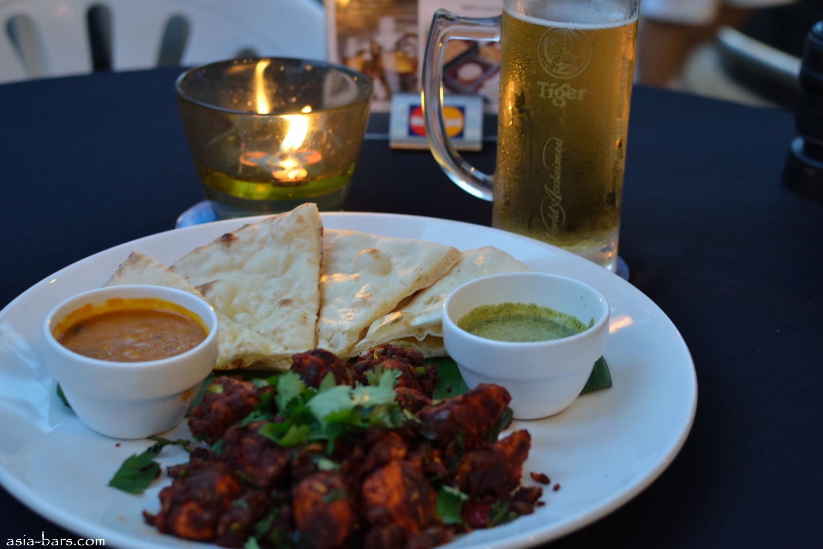 Entering from the street-side reception , SOULed OUT is primarily a large, canopied, open air space, with the main bar at the rear, and indoors, up some stairs, the air-conditioned mezzanine level, with another bar, some lounge seating and more table settings. Some additional tables are located on the open balcony overlooking the main action below. The furnishings in the main open air area are white molded plastic chairs, and tables with white table clothes. The mezzanine dining area has a more sophisticated atmosphere, with exposed timber beam ceilings, dimmed lighting and timber flooring. There are three very large projection screens plus five plasma screens arranged around the spaces- and “live” sports viewing is a big part of the weekend evening action- particularly when major Premier League matches are scheduled.