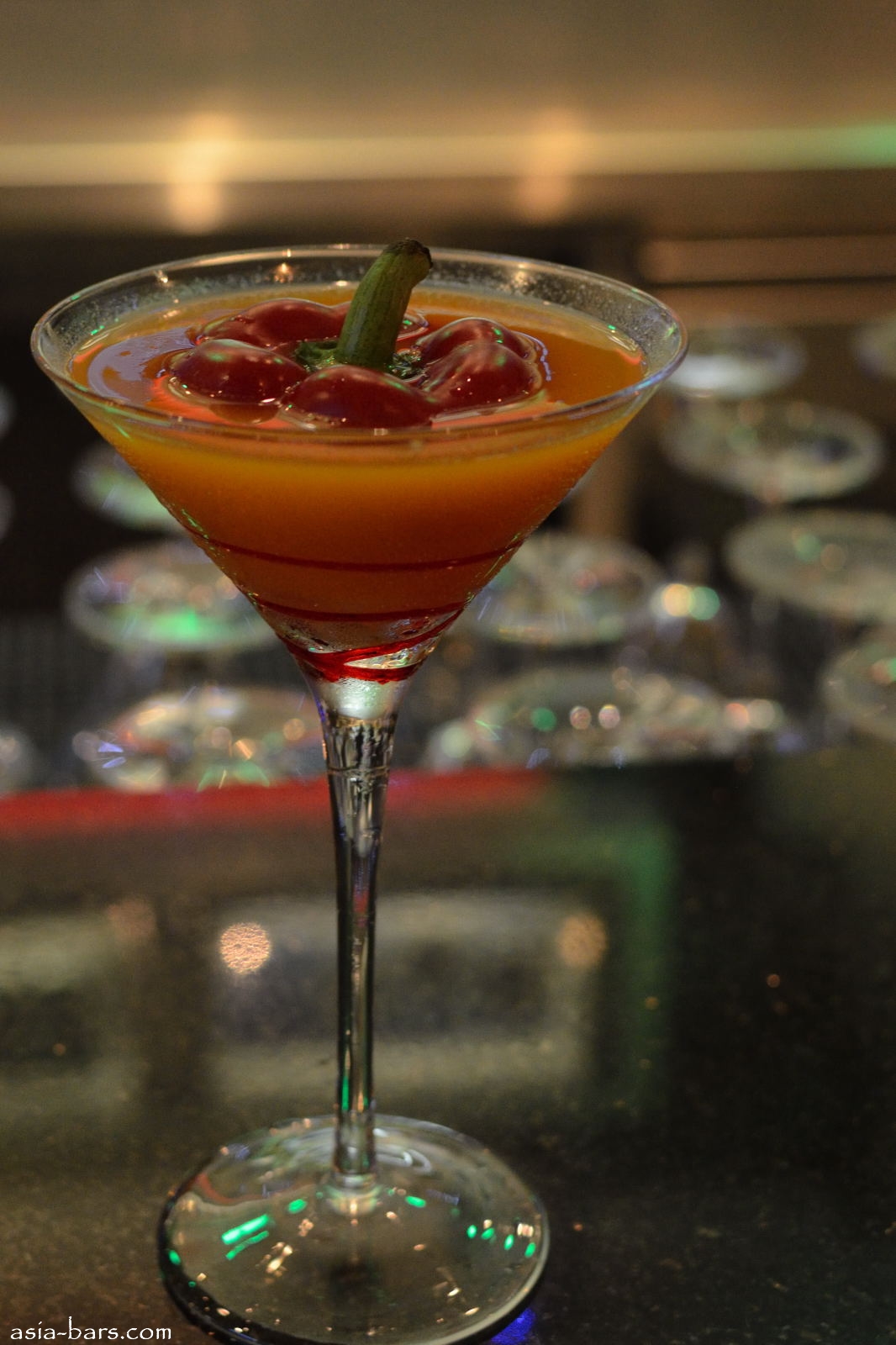 MANGO MAMBO– Award winning cocktail- Rum, Creme de Cacao White, fresh mango, mango syrup, red capsicum, and lemon wedges.