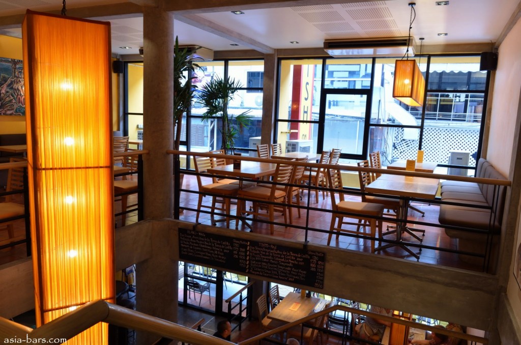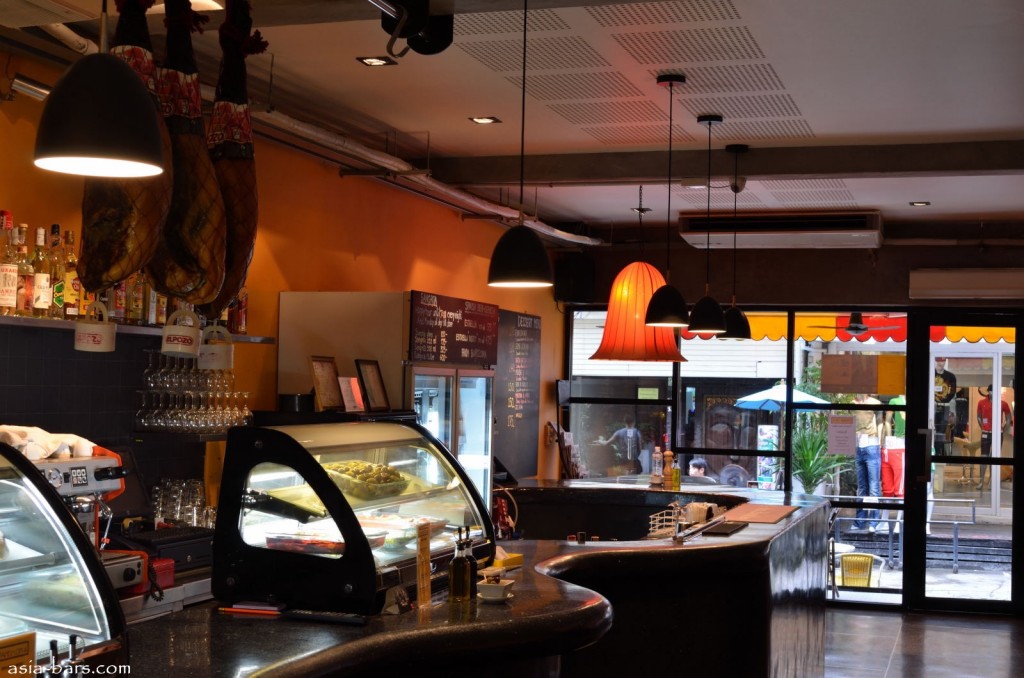 Spanish on 4 occupies a double fronted space in a row of shoplots inside the soi (street)- and the exterior is painted in the distinctive national colors of Spain- orange and red. The interior is a bright, open space set over two levels, with a central stairwell connecting the two levels. There is a raised timber deck out the front- with a large retractable awning to protect guests from both rain and the tropical sun during the day. The outdoor tables are popular for people watching whilst enjoying a drink or coffee. On the ground floor, the prominent black terrazzo bar runs down one side- with some bar stools at the end near the entrance, and with glass food displays towards the kitchen end. Large Spanish cured hams are suspended from the ceiling, and there is an open kitchen. The main dining room is split into two sections by the central stairwell- and the use of light colored timber furniture gives the space the casual, unpretentious feel of a true tapas bar. Original paintings from local artists are hung on the walls- and in the upstairs dining room a large wall mural is a feature. The upstairs dining area has the open main kitchen at one end, and the same style table furnishings as downstairs.