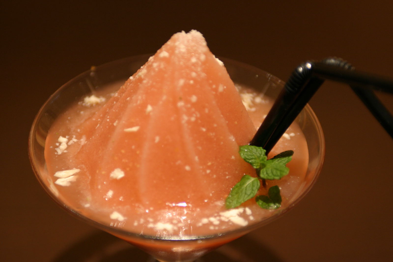 Amaou & white chocolate frozen cocktail- strawberry from Fukuoka, fresh grapefruit juice, fresh lemon juice, natural syrup, Grey Goose Vodka and white chocolate
