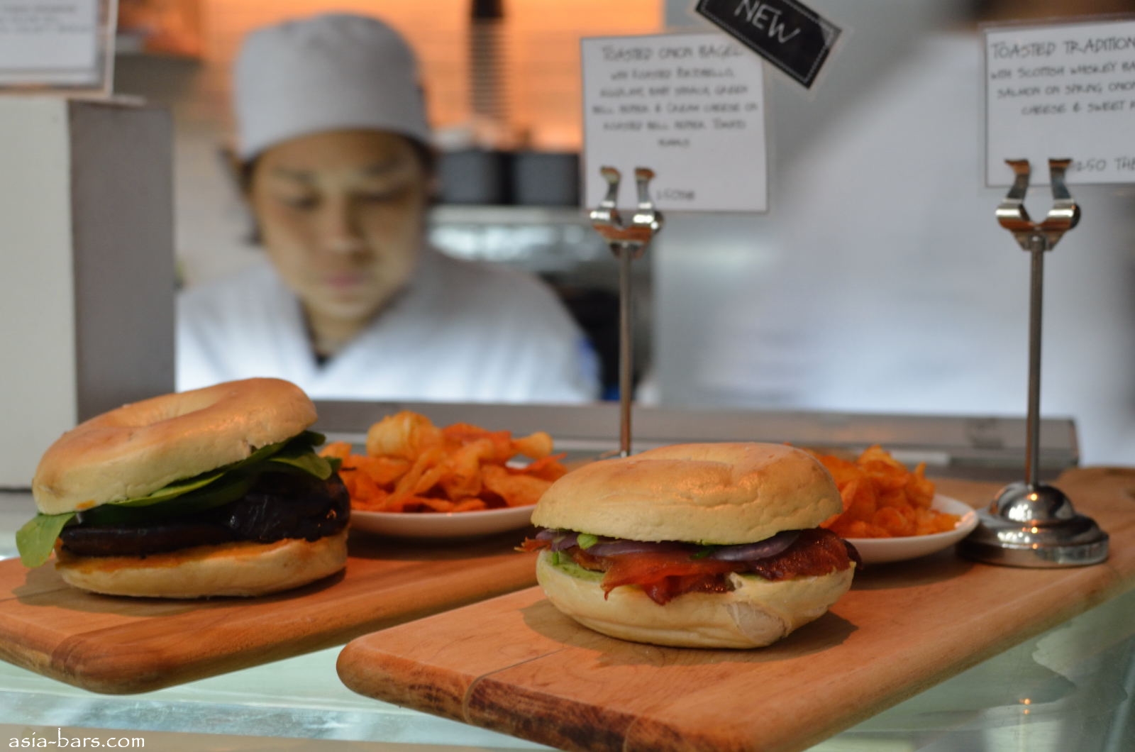 (L) Toasted Onion Bagel with roasted Portobello, eggplant, baby spinach, green bell pepper & cream cheese