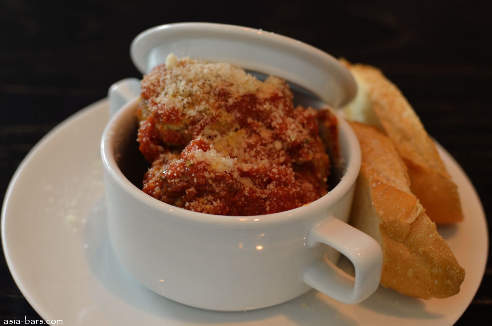Spicy Pork Meatballs – Hand made meatballs of pork, chili and fennel with Dean & Deluca tomato basil sauce