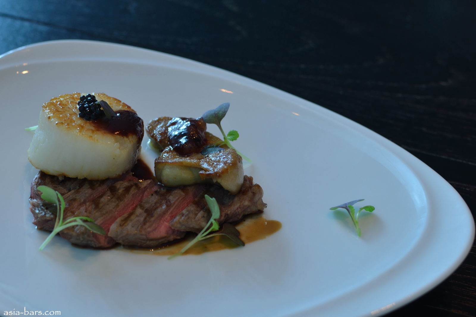 Brandt Beef Trio – American striploin from Brandt family farms, seared Alaskan scallop and Soulard foie gras with raspberry reduction, demiglace and truffle caviar.