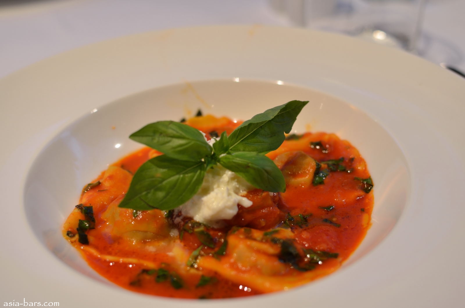 Ravioli stuffed with Spanish Bellota Ham, tomato juice and Burrata cheese