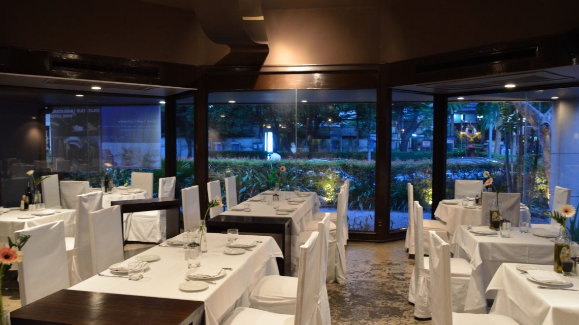 The interior design of the main dining room features an uncluttered, modern feel- with the predominant use of white linens on tables and chair coverings, contrasted by dark timber beams and a coated concrete floor. Full height glass panels on all sides of the room give diners views outside into the gardens, with high outer boundary walls maintaining privacy. Several alcove spaces protrude out into the garden- and provide discrete table settings within the overall main dining room.