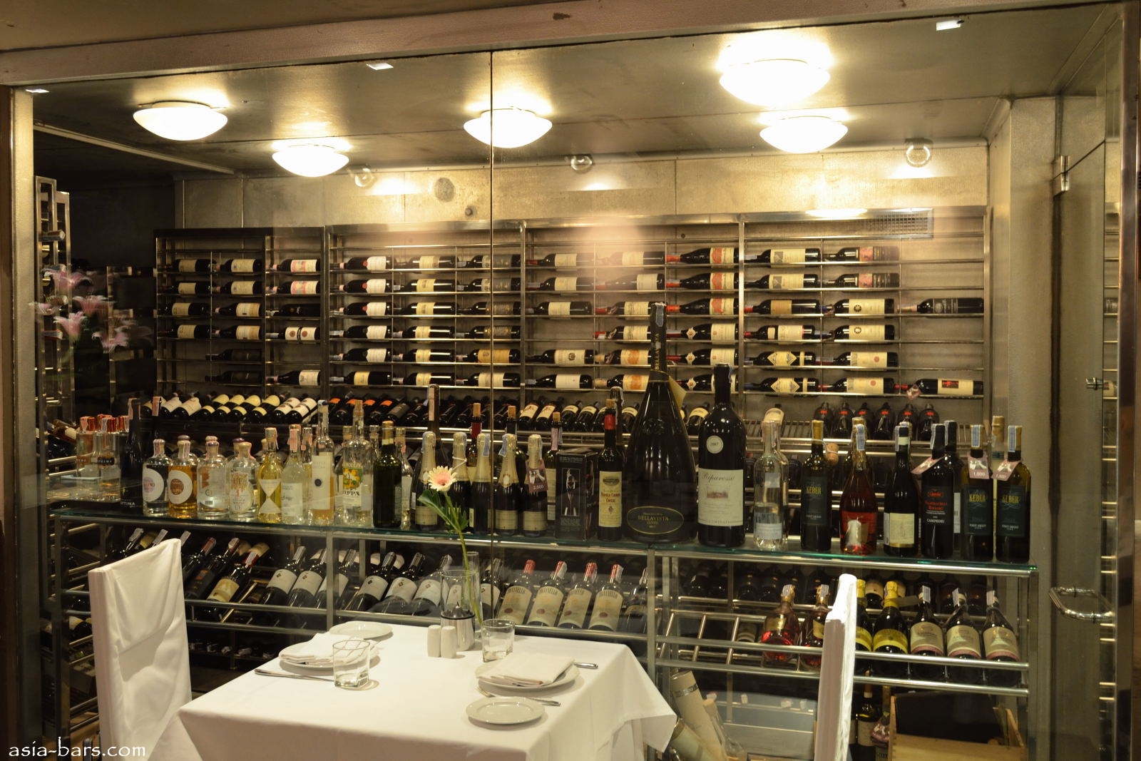 A feature of the main dining area is the glass encased, walk-in wine cellar, where the extensive range of mostly Italian wines are displayed. Guests are welcomed to enter the cellar and make their selections directly from the bottle racks.