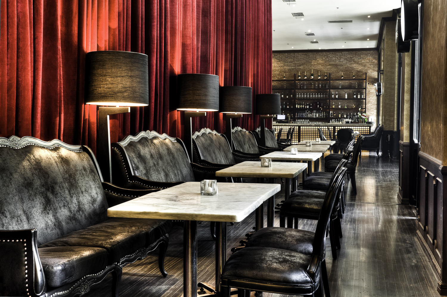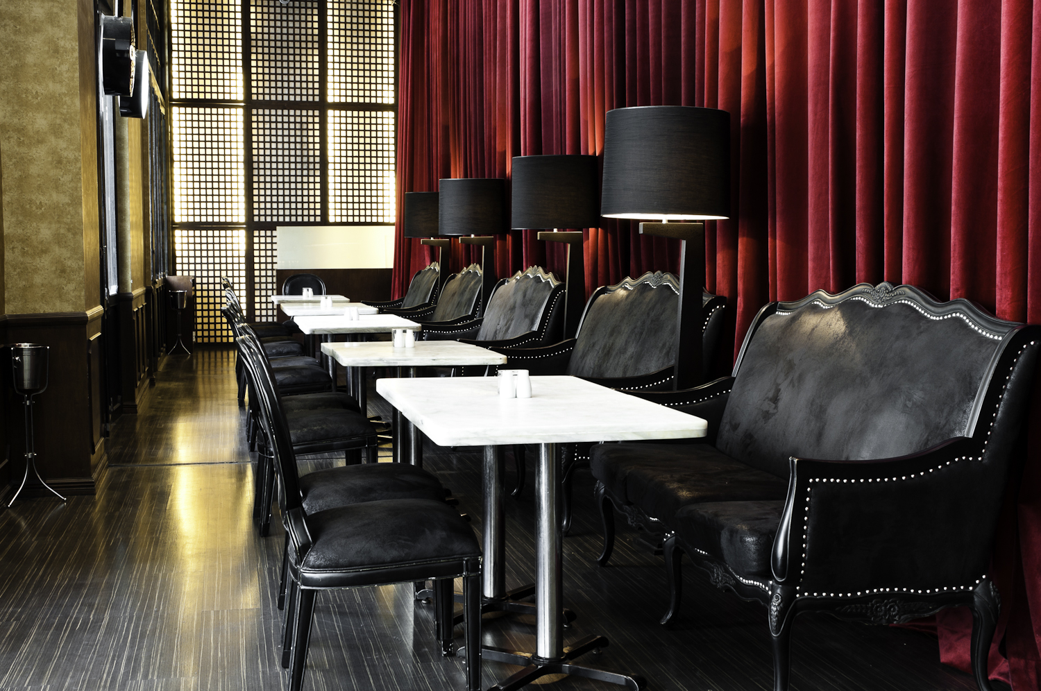The Cafe has a dining space and bar inside, and additionally tables outside facing onto the Atrium space. The style of decoration is contemporary chic – with extensive use of natural building materials such as exposed brickwork, timber flooring, and plush heavy velvet curtains. The dining tables feature white marble tops, and elegant chairs and sofas are upholstered with a matt black “suede” leather. The seating arrangement inside is spacious with plenty of room between tables. The table outside are more numerous and offer excellent “people watching” opportunities.