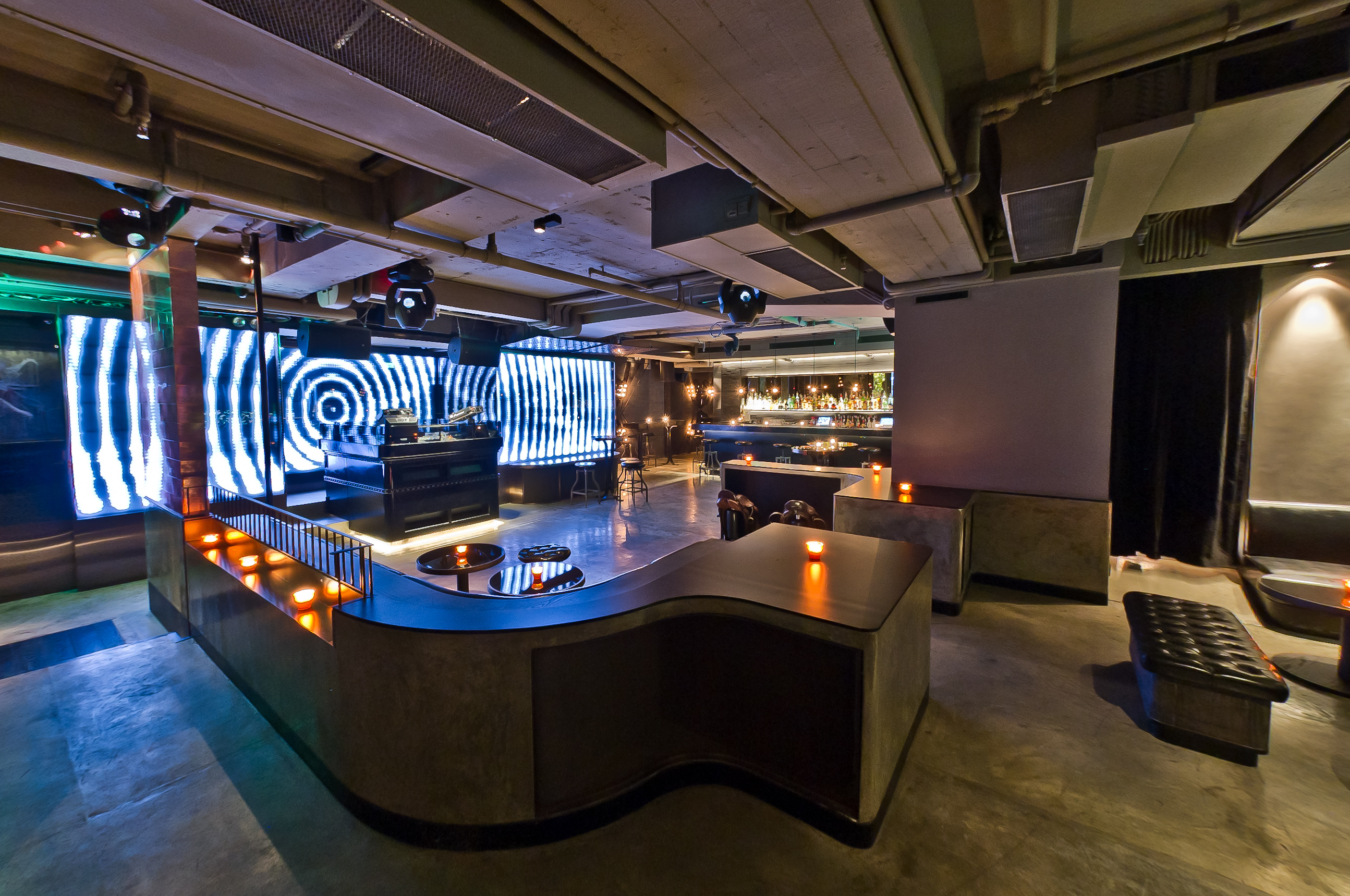 Entering the main indoor space, the design cues a modern, minimalist style, utilising combinations of “industrial” materials such as dark graphite colored tiles, raw concrete and mesh screens, and highlighted by the sleek , jet black DJ booth, surrounded by a huge, floor to ceiling LED wall. The main bar features a long black counter with bar stool seating set along one wall inside the entrance. A mirrored back bar display, with shelves of highlighted liquor bottles adds an attractive element to the bar area. FLY offers an  innovative cocktail and drinks menu- with a specialty being the house-infused spirits and alluring cocktails.