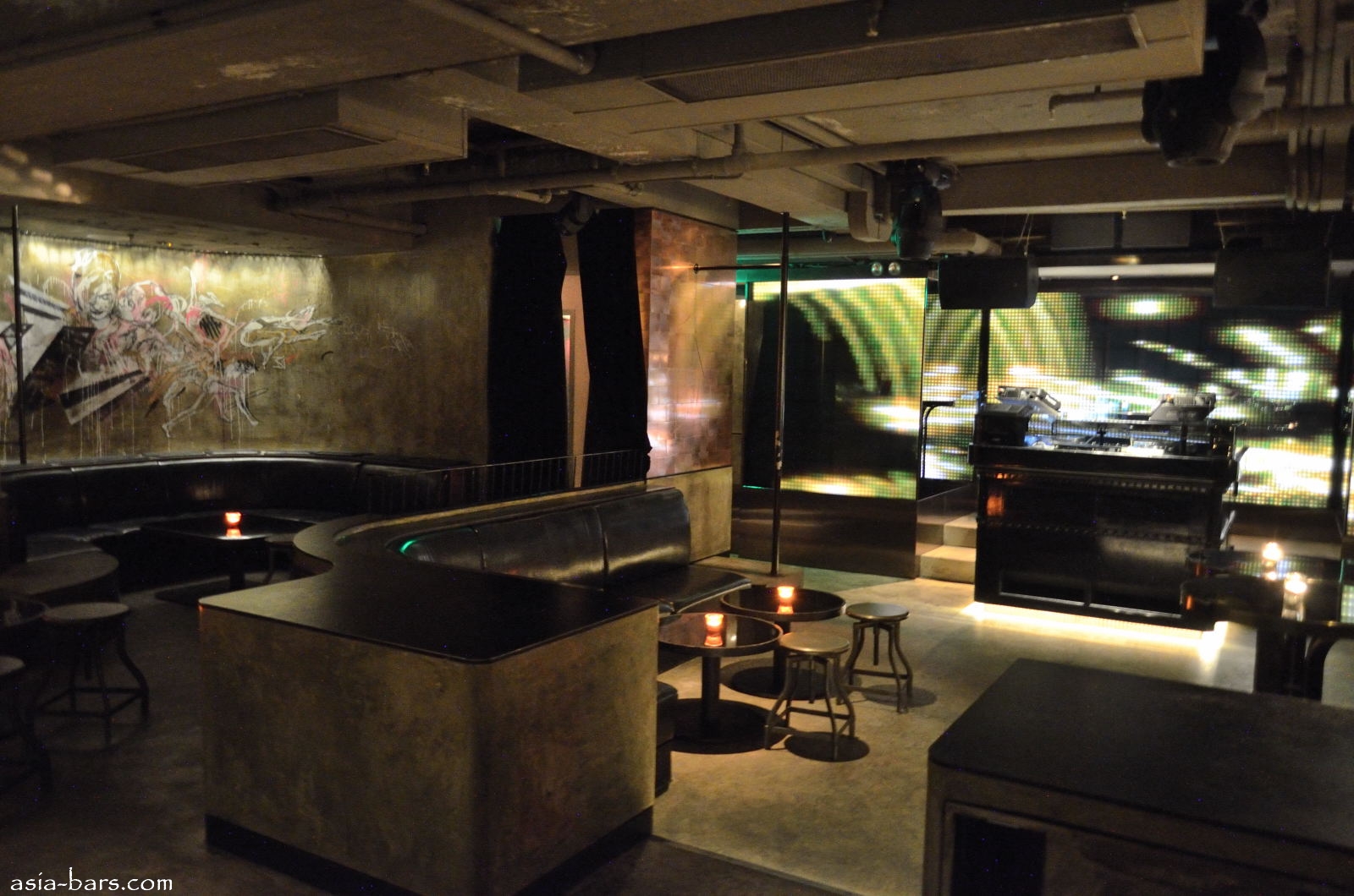 For the main club area- the “Back Room”-  the acoustics and lighting were the fundamental issues driving the design- so that all the clubber’s senses are engaged in the experience- hearing, seeing and feeling the music. The massive Turbosound system is powerful enough to literally make the hair on your skin vibrate. The LED wall displays graphics are synched to the sounds and beats being pumped out by the DJs. The furnishings are arranged in flowing curved settings- with leather padded bench seating, metal stools, and tables that can double as dancing platforms.  Other contemporary design elements are the living street art featured on two of the walls- the original work of renowned French graffiti artist, LIES ONE.