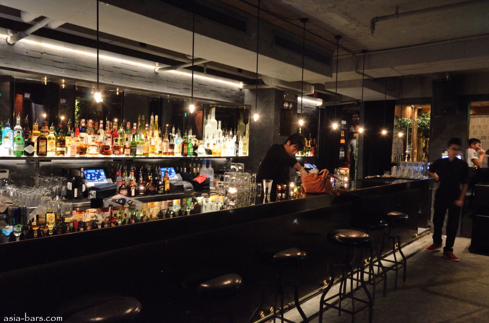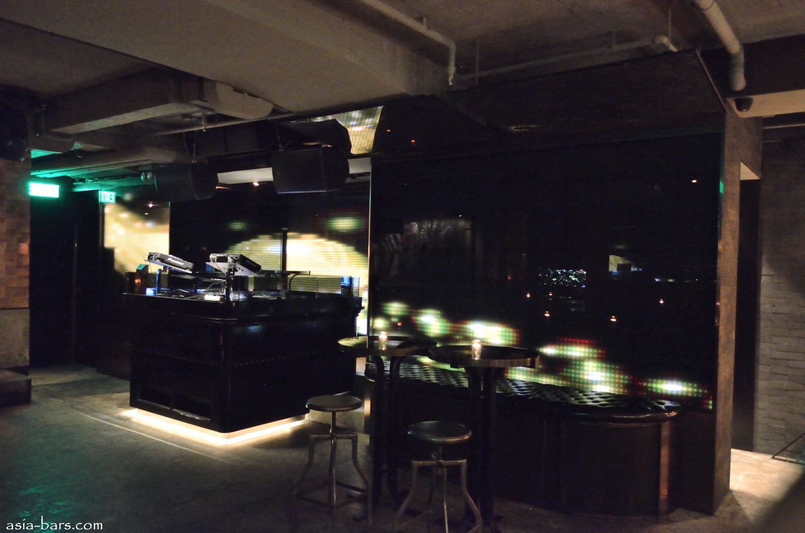 The design, by local Hong Kong interior designer Alicia Tan, comprises two distinct spaces. The front terrace area of the street level entrance has been lined with timber panelling on the walls and ceiling, and with some greenery providing by plants to soften the egdes. The “playful” features such as a pair for swing chairs suspended from the ceiling, and a hopscotch grid painted onto the dark timber floorboards, provide an atmosphere for relaxed drinks and chilling out, and also as a primer for the more serious partying that awaits behind the  dark tinted glass doors.