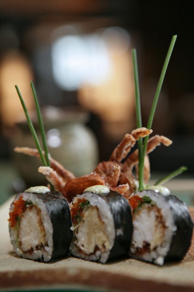 dynamite spider roll– softshell crab, chilli mayonnaise, cucmber and wasabi tobiko sauce.