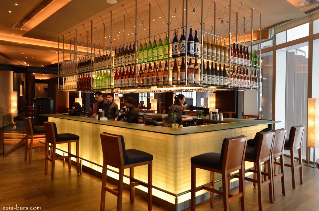Entering the upper level Lounge, past the reception area, the impressive wine cellar of over 2,000 bottles is displayed in glass fronted racks along the passageway into the Lounge and bar area. The Sake Bar stands prominently in the centre of the upper level- exuding an amber colored glow. Bar stools extend around three sides of the bar- and overhead a suspended display rack of sake bottles compliments the functionality of the bar. Behind the bar area, the Lounge has some high tables and chairs, comfortable sofa seating in discrete arrangements, and a semi-private space. The palette of colors for the furnishings and lighting reflects the traditional Japanese colours- subtle oranges and reds, charcoal and beige, with dark timbers. The Lounge is a popular destination for pre-dinner drinks and cocktails, and later in the evenings DJ’s play mixes of tunes creating a more vibrant atmosphere. The Sake Bar has an extensive selection of over 40 different sake varieties, the signature cocktails feature Japanese spirits blended with fresh seasonal fruit juices to create tempting concoctions.