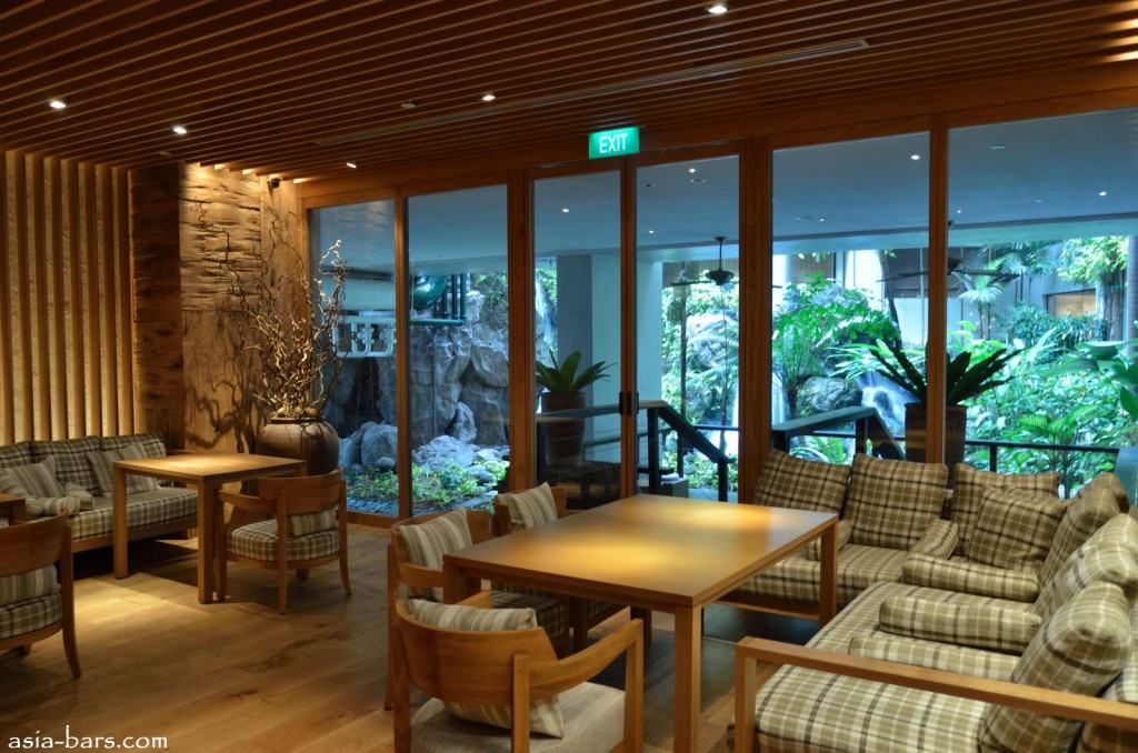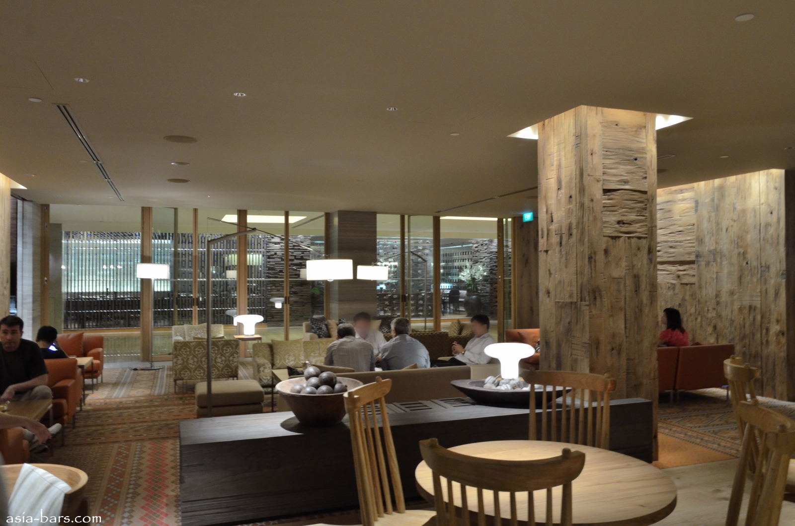 The LIVING ROOM area is furnished in the style of a residential lounge room, with sofa seating, small tables and armchairs- all generously spaced to allow for privacy. A central column covered with raw timber planks, and walls with the same raw timber finishing are signature elements of a Tashaki Sugimoto designed space.