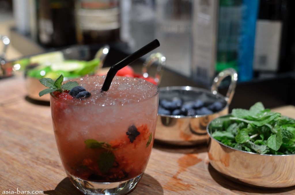 “BERRY NICE” cocktail- special creation at 10 SCOTTS- Belvedere Vodka, blueberries and raspberries, mint leaves, brown sugar, lemon juice and sugar syrup