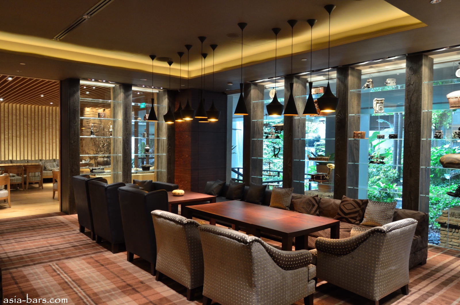 Progressing through The DINING ROOM, the next spaces encountered are THE TERRACE and THE VERANDAH, and to one side, THE COLLECTION ROOM. The outdoor Verandah and Terrace feature a luxuriant garden setting with a rock waterfall, providing the nature and serenity of a traditional Japanese garden. The COLLECTION ROOM features a more richly textured environment, with carpeted flooring, and plushly upholstered lounge chairs and dark timber tables making this an ideal setting for relaxed conversations or discrete business meetings.