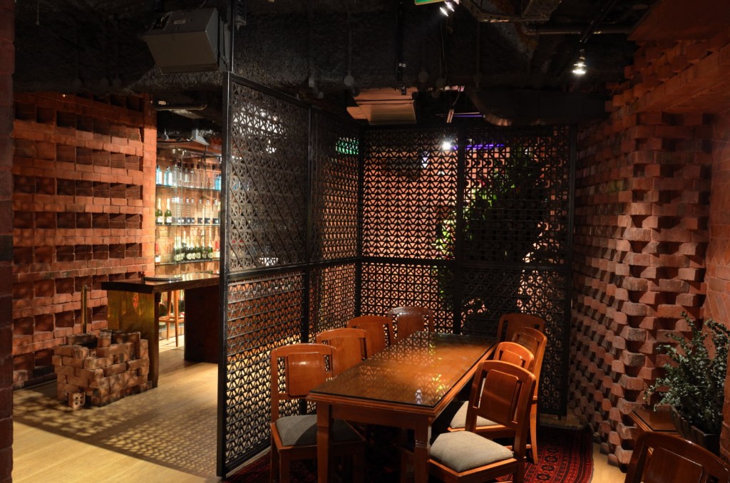 For the layout of BRIX , named after the predominant building material used in the construction, the designers have created three zones within the overall space. The nightclub is accessed by an external staircase adjoining the main hotel entrance. A solid, rough metal door at the entrance opens into the dimly lighted reception area. Open stacked brick walls separate out the different spaces- the more intimate Wine Bar and Whisky Bar occupy a corner section of the overall space- and the Music Bar the balance. The brickwork throughout BRIX has been employed in a variety of ways, creating differing patterns, textures and decorative effects. Overhead, the ceilings are open, exposing the metal ductwork and light fittings. Spotlights highlight the texture and patterns of the brickwork, and create a toned down warmth to the atmosphere. Floors are dark stone tiles in the Wine Bar and Whisky Bar, and timber elsewhere.