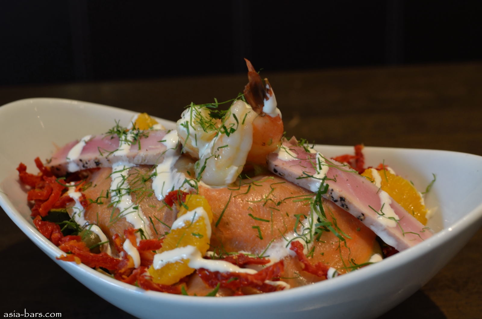 Meeresfrüchtesalat / Seafood Salad – Mixed salad with smoked salmon, seared tuna, prawns, semi-dried tomatoes, olives, grilled zucchini, orange wedges and sour cream tossed with house dressing