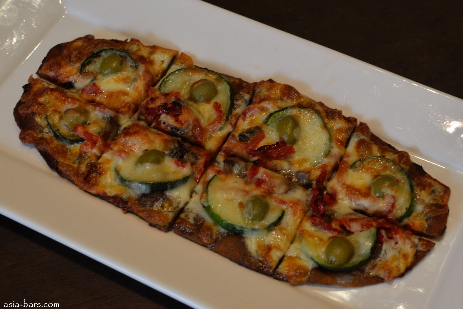 Brotzeitflade Vegetarisch / Vegetarian Pizza – Tomato sauce, mozzarella cheese, grilled zucchini, olives, semi-dried tomatoes and mushrooms.
