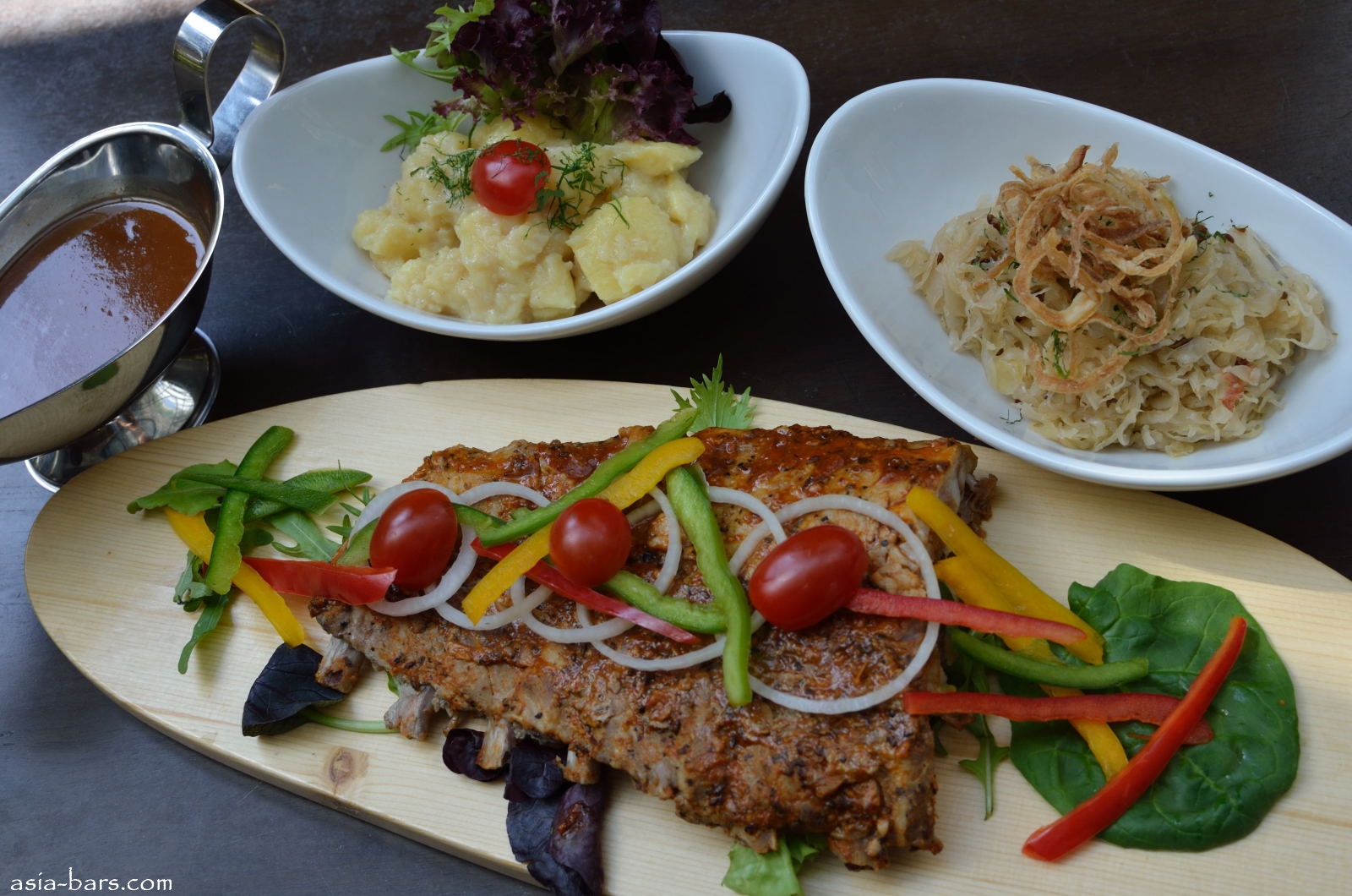 “Schweinerippchen“- oven roasted marinated pork ribs served with sauerkraut and potato salad
