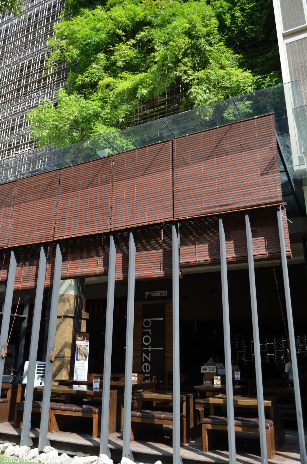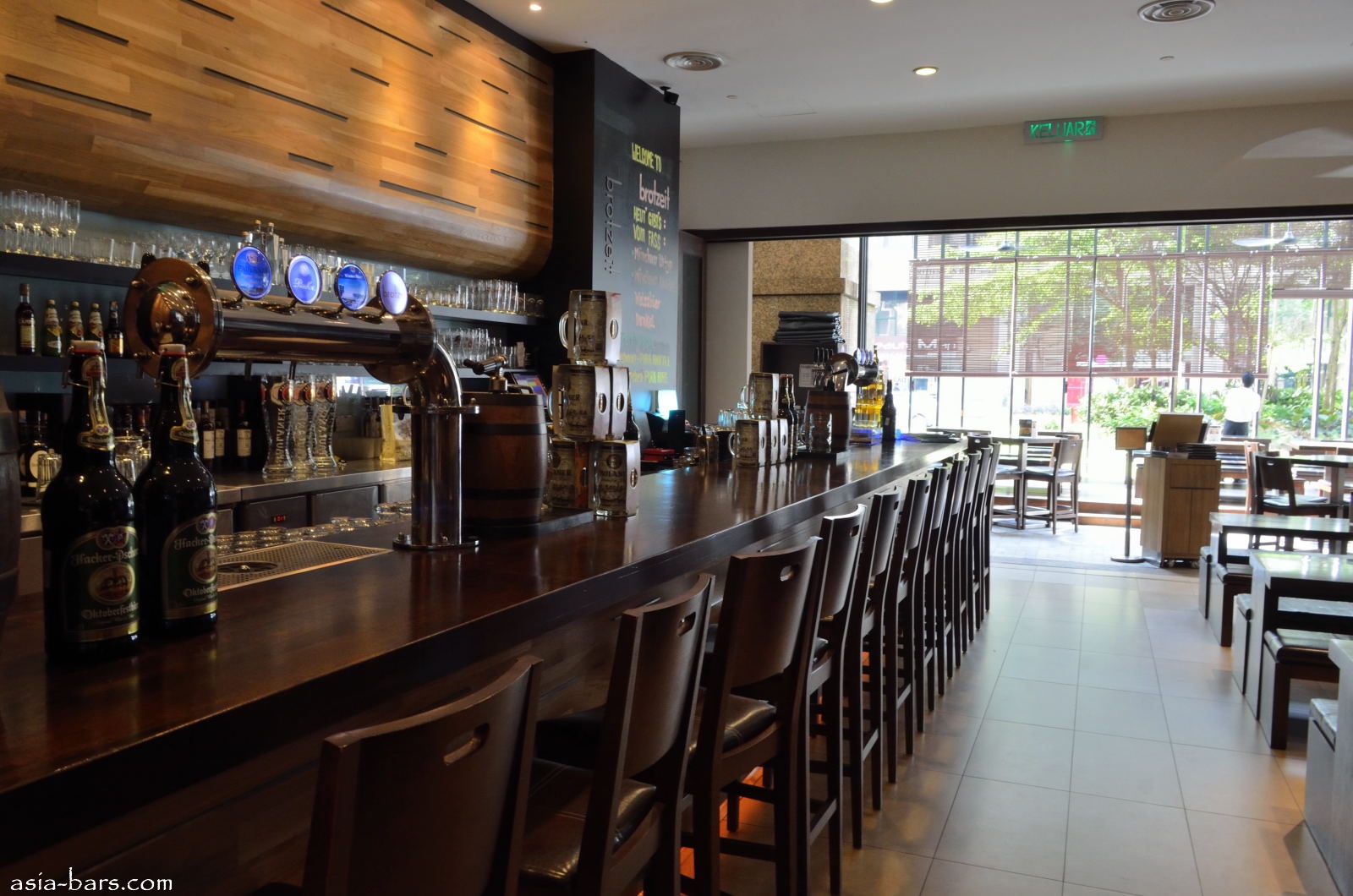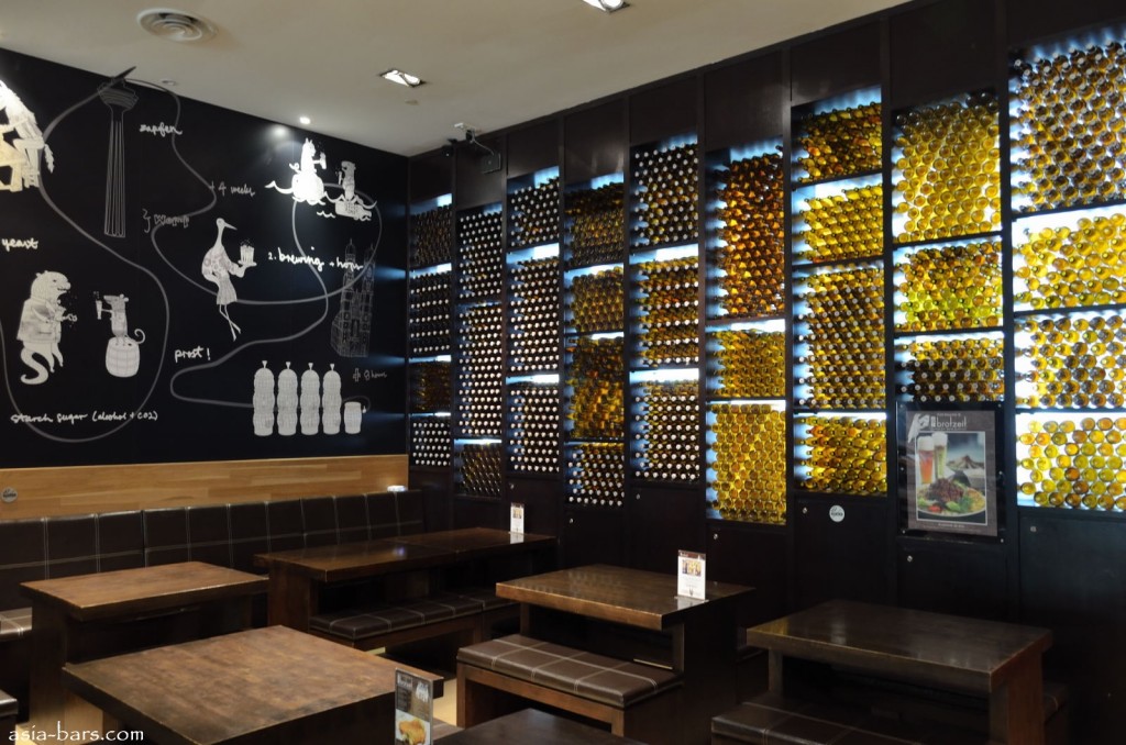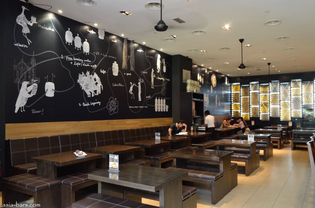 The Brotzeit restaurant at Mid Valley Megamall has an attractive location at street level – with both indoor and outdoor spaces- and facing out over grass lawns and gardens. The interior design features a typical contemporary German style dining – with dark timber tables and bench seats, padded with dark brown leather. The interior room is a bright, spacious space- highlighted by the rear wall of stacked empty beer bottles that are back lighted and provide a distinctive character to the room. Along the wall opposite the bar is a full length mural depicting in cartoon style the brewing processes. The long main bar extends down from the entrance, and is an attractive combination of light and dark timbers, with a row of dark timber bar stools.