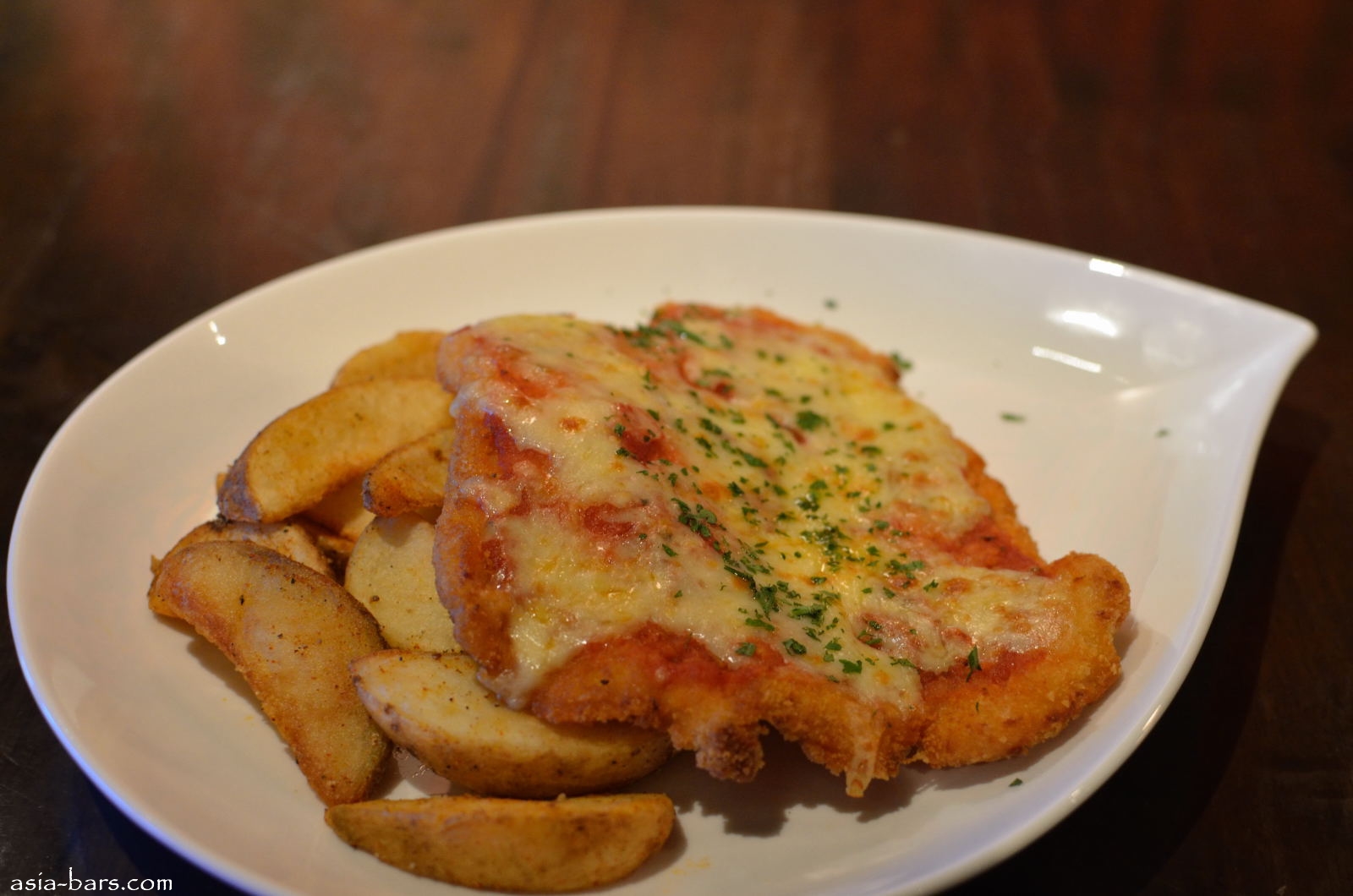 Chicken Parmigiana– Breaded chicken breast with tomato sauce and melted cheese, served with potato wedges