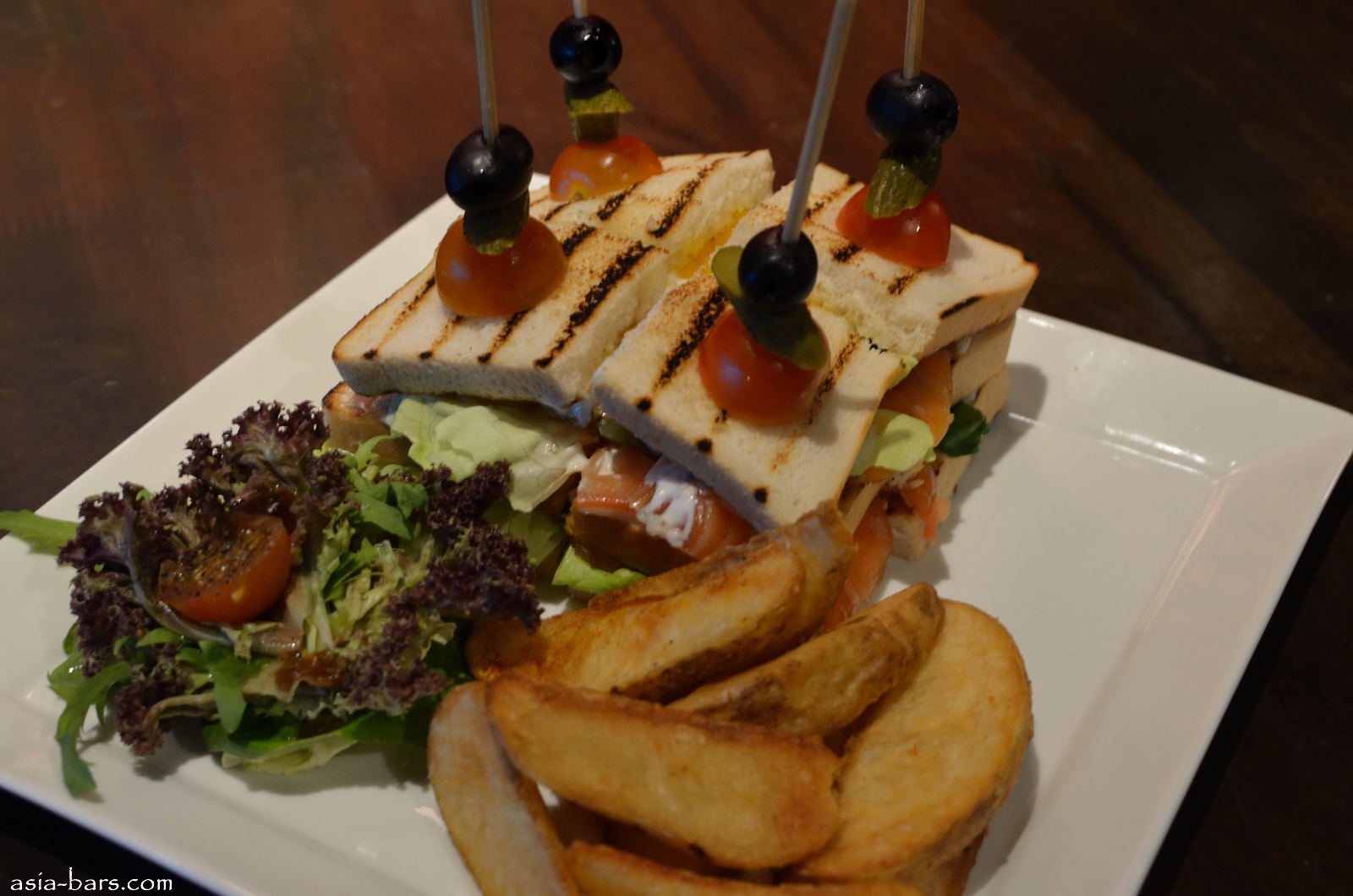 Garibar Sandwich– white bread with smoked salmon, tomato, fried egg, salad and tartare sauce- served with potato wedges