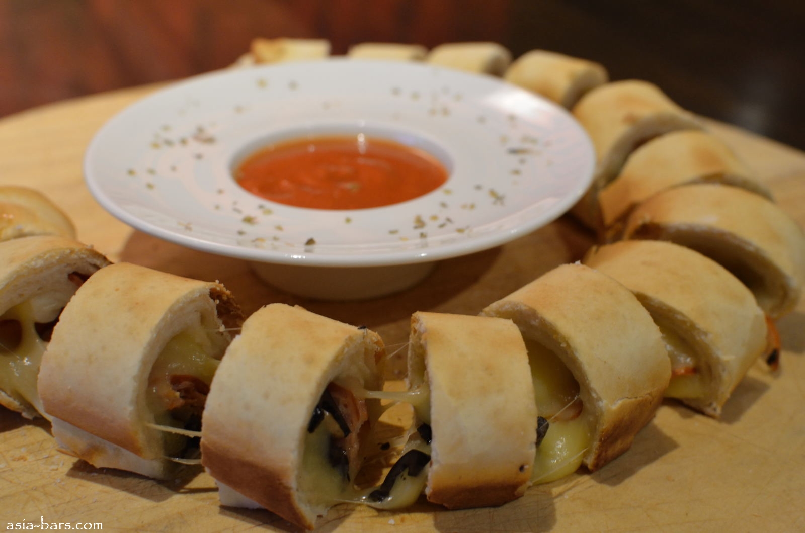 Rollino- Pizza dough rolled with mushrooms, chicken sausage, black olives, tomato sauce and mozzarella