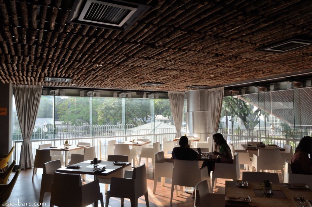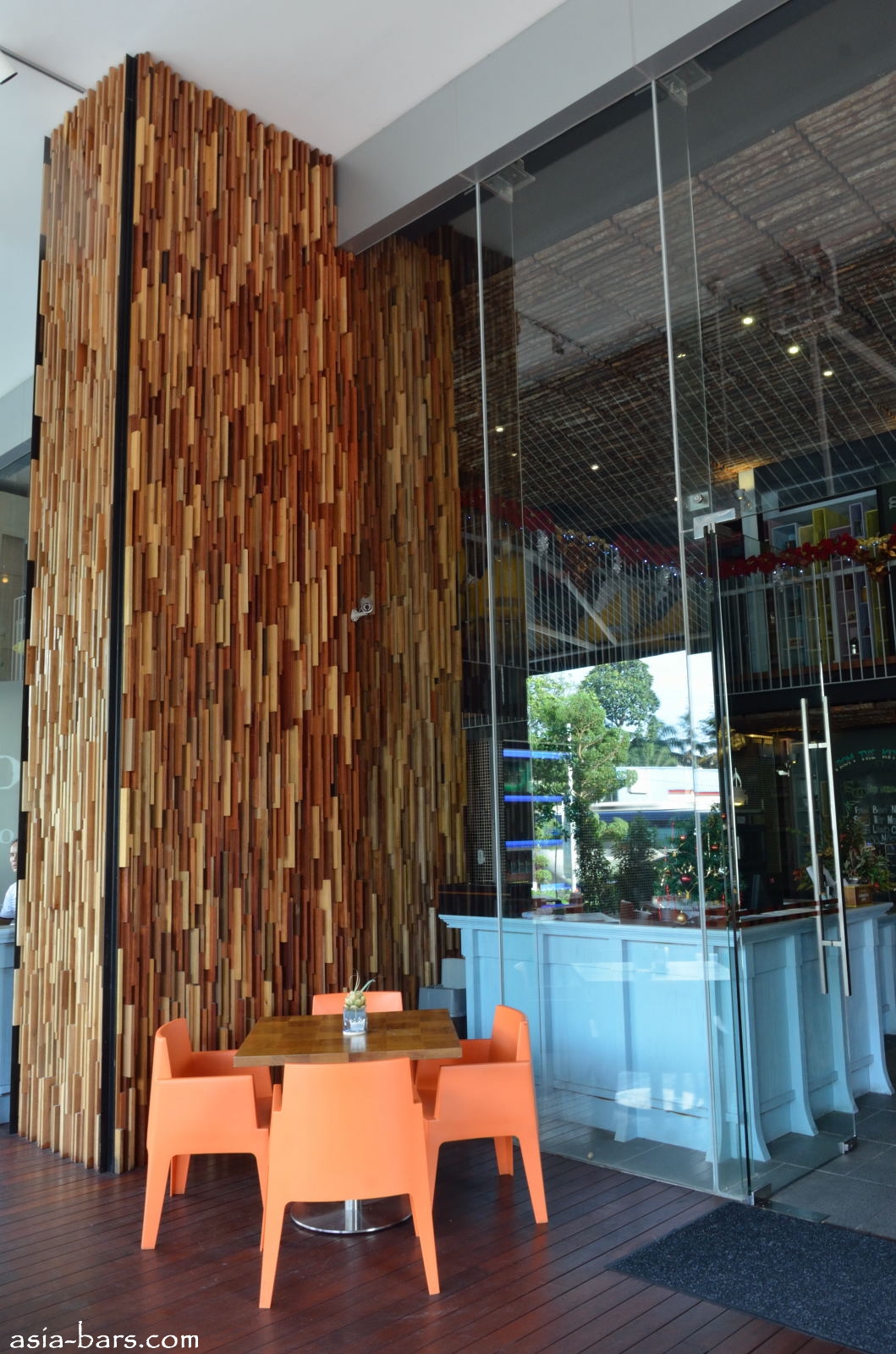 The new SOULed OUT occupies a large ground level space within a modern office tower- and comprises both indoor dining and bar, and an outdoor terrace zone fronting onto Jalan Ampang. The interior is spread over two levels, with the kitchen and main bar area on the ground, and two dining rooms on the upper, mezzanine level. The design has been created by international designer Ed Poole who has also worked on other projects for the SOULed OUT group- the ultra-popular WIP restaurant & bar in the Bangsar district of KL, and the stylish restaurant & supperclub- 7ATENINE . For the new outlet, the designer has created an attractive contemporary style, with added elements of sophistication- combinations of designer furniture and natural materials- to provide a visually engaging experience within a comfortable, relaxed atmosphere. The full height glass facade is dominated by two towering pillars that stand either side of the glass doorway entrance to the interior. Constructed from a multitude of individual rectangular cuts of timber, pieced together by hand onto the pillars in random pattern, the texture and appearance evokes the towering native tree trunks of a tropical rainforest. Inside arrangements of “bakau” timber poles are cut and suspended from the ceilings. Large sliding chalkboards- both at the ground level of the entrance lobby, and on the upper mezzanine level graphically display the specials of the day from the kitchen and bar.
