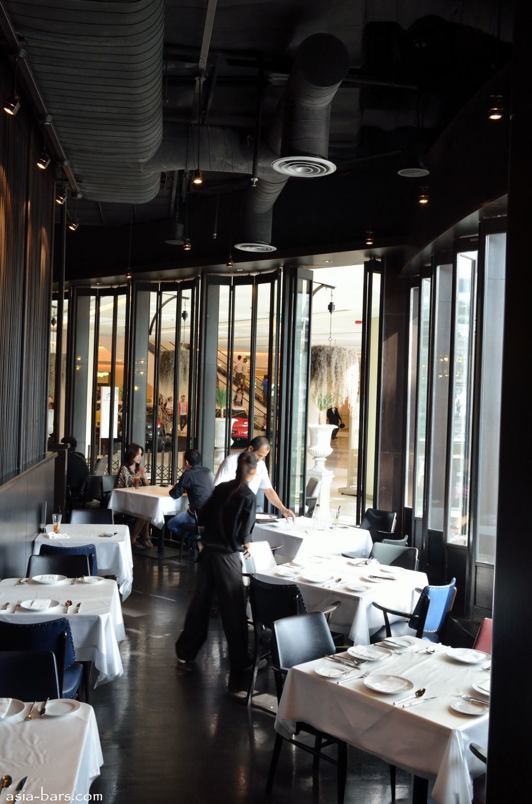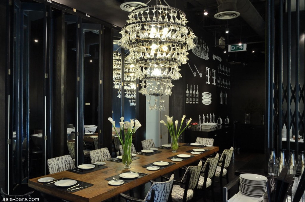 The design cues on elements of the stylish cafes found in the major cities of Italy- combined with contemporary, “industrial” features such as the black exposed ceiling ductwork, raw concrete structural pillar, and extensive uses of black metal lattice work screens as room dividers. The overall atmosphere is of understated elegance, with dimmed lighting provided by whimsical chanderliers, polished dark timber flooring, predominantly black walls, long black leather banquettes, and table settings of crisp white linen, polished silver cutlery. The front seating section is bathed in daylight from the full length, black framed, folding glass windows.