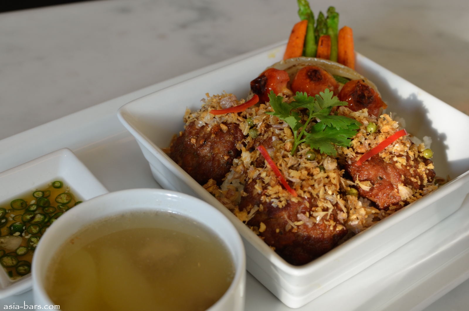 Minced Pork and Smoked Bacon Balls– served with plain rice, clear soup and side vegetables