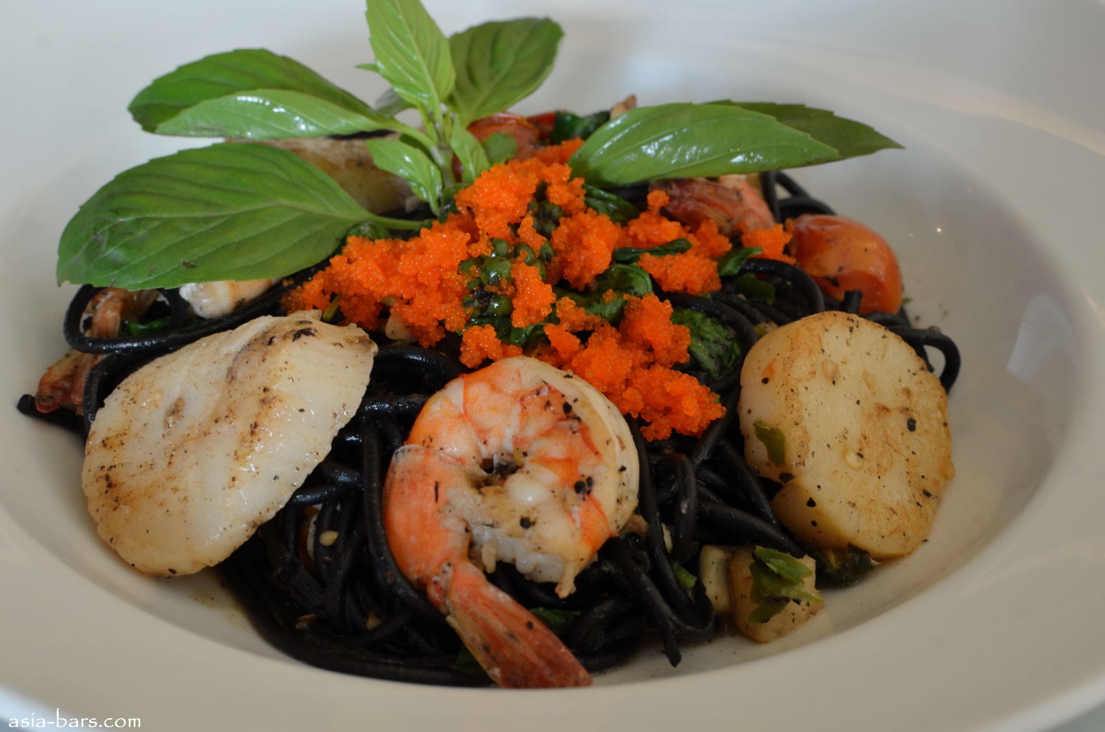 Spaghetti Cha Cha Cha– ink spaghetti with shrimps and scallops, stir-fried with Italian basil leaves, green peppercorns and chillies