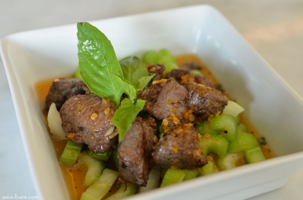 Spicy Grilled Lamb– grilled diced lamb with crispy celery stems in spicy Thai sauce