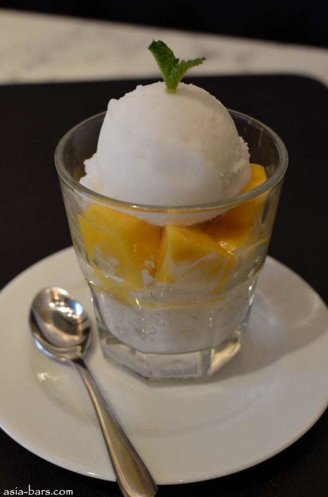Greyhound Parfait- Sticky Rice & Mango – served with Coconut Sherbet and coconut milk and mini mint leaf