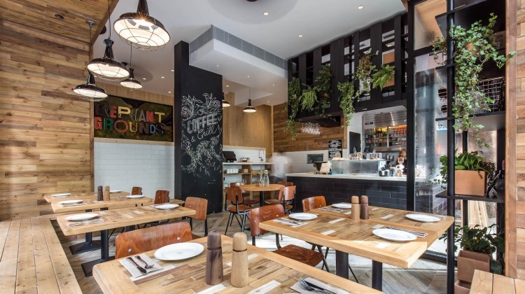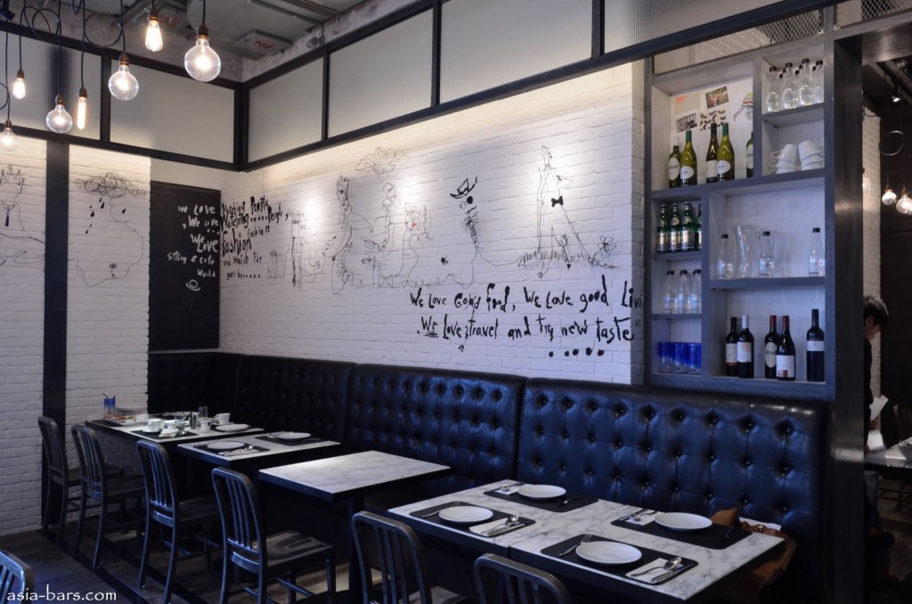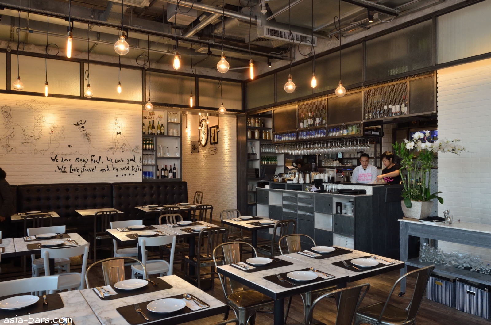 The Greyhound Cafe is located in a corner space of the Podium zone within the prestigious ifc mall in central Hong Kong. The cafe presents an open facade to the main mall floor, with windows providing both abundant natural light and a pleasant outlook over the harbourfront. The interior design faithfully reproduces the quirky, contemporary chic style of the Bangkok cafes. Details such as the light globes suspended overhead from looping cords, to the hand-painted wall murals (the same Thai artist who has decorated the Bangkok cafes was flown to Hong Kong to personally create the murals on the walls) to replicate the ambiance of the Bangkok Greyhound experience. The cafe seats around 120 patrons- withvarious table arrangements, a black leather banquette across the rear wall, and a private room opposite the bar counter.